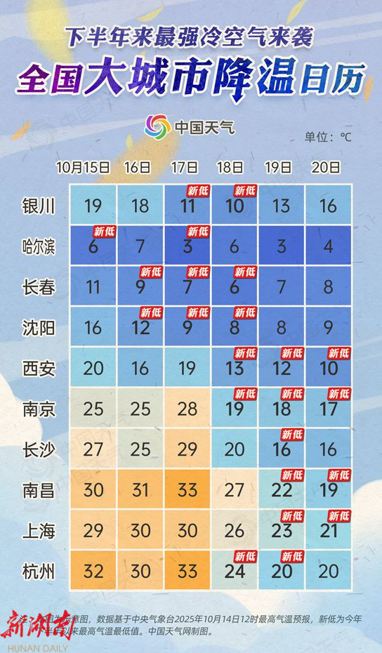 两股冷空气接连来袭,多地气温连创今年下半年来新低。受冷空气影响,10月14日至20日,乌鲁木齐、哈尔滨、沈阳、长春、天津、济南等19个大城市的最高气温将陆续刷新今年下半年来最低纪录。