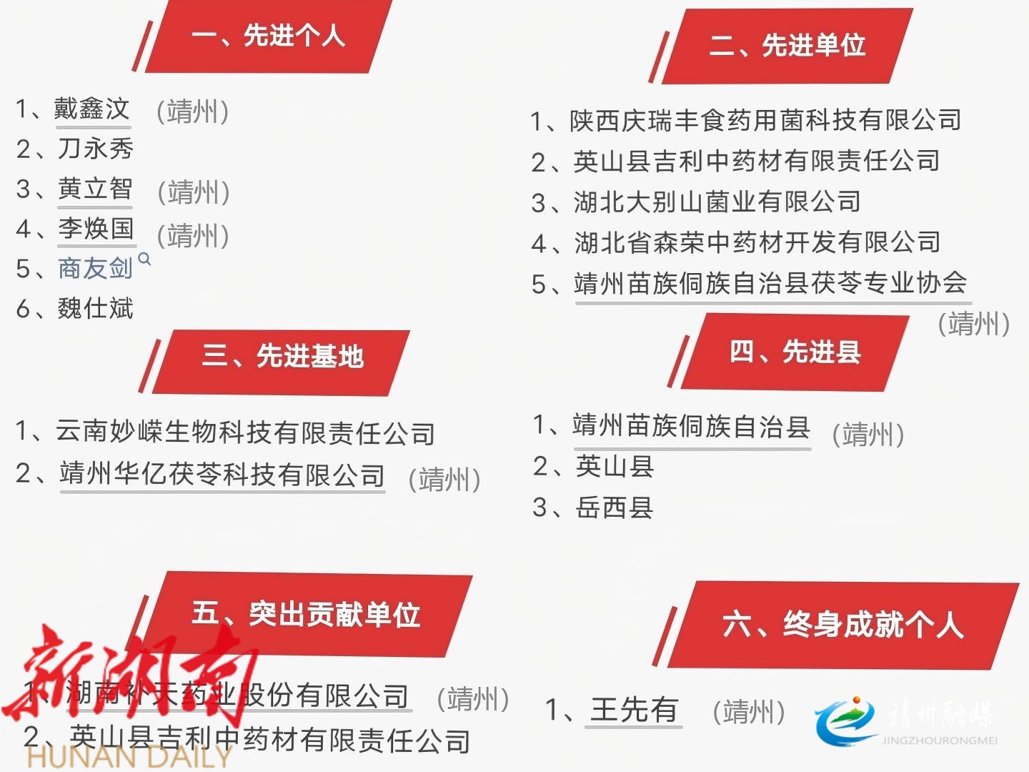 作为“中国茯苓之乡”,靖州 收获多项荣誉:成功入选先进县;戴鑫汶、黄立智、李焕国获评“先进个人”;靖州茯苓专业协会获“先进单位”称号;靖州华亿茯苓科技有限公司获评“先进基地”,湖南补天药业股份有限公司获评“突出贡献单位”,王先有获评“终身成就个人” 。
