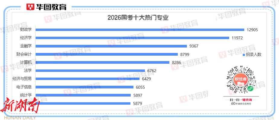 据中央机关及其直属机构2026年度考试录用公务员招考简章内容分析,几乎所有职位都有专业要求,其中,财政学类以12905的可报考岗位总人数位居热门专业榜首,经济学类、金融学类紧随其后。