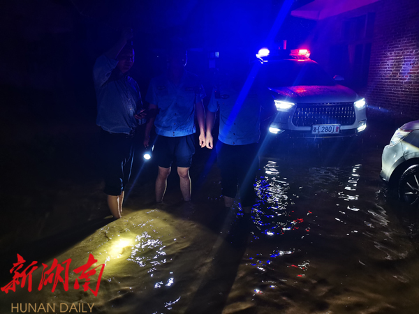 文昌村因雨势大、路旁的排洪渠因为山洪过猛,排水不赢,全部倒灌漫过了公路,涌向民房。20点50分,沙田派出所值班民警接到群众报警电话后,立即赶往事发地点。警车在暴雨中蹚水前行,有时根本分不清哪里是路哪里是路旁的防洪渠,尽管驾驶警车的民警有着多年驾驶经验,也只能凭感觉缓慢前行,实在没底的地段时只好让其他民警用竹竿探路。安全到达罗家后,处警民警合力将报警人家里的电器一一抬到安全地带,并找来到工具疏通排水沟,防止洪水继续倒灌进家。