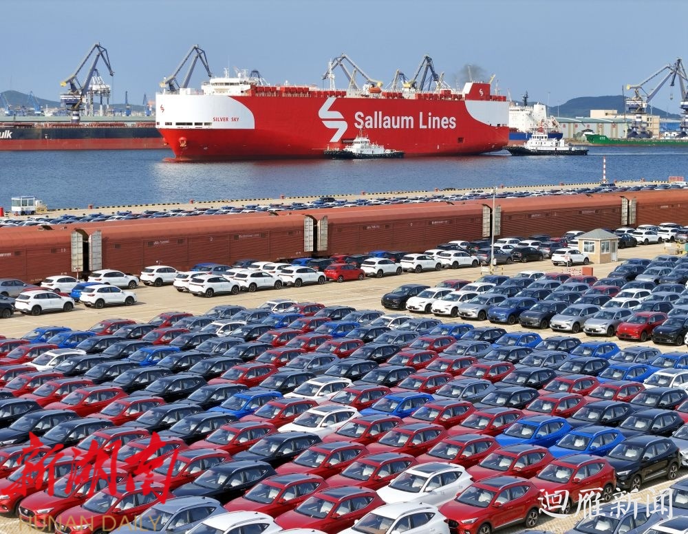 2025年9月14日,国产汽车在山东港口烟台港集结等待装船出口(无人机照片)。
