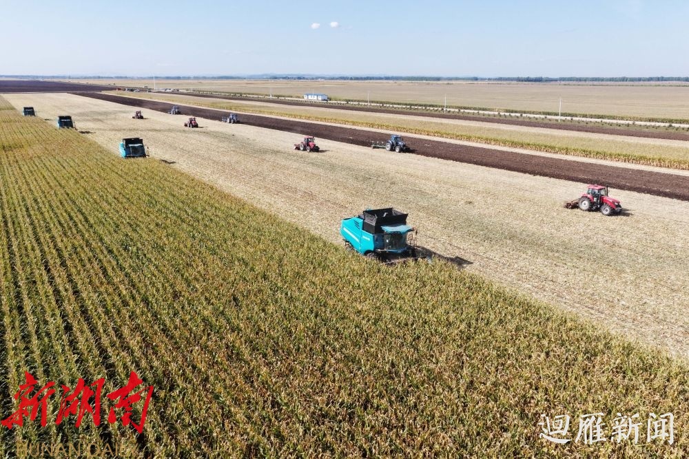 2025年9月23日,在位于双鸭山市的黑龙江北大荒农业股份有限公司友谊分公司一旱田地块,大型农业机械在进行玉米收获作业(无人机照片)。