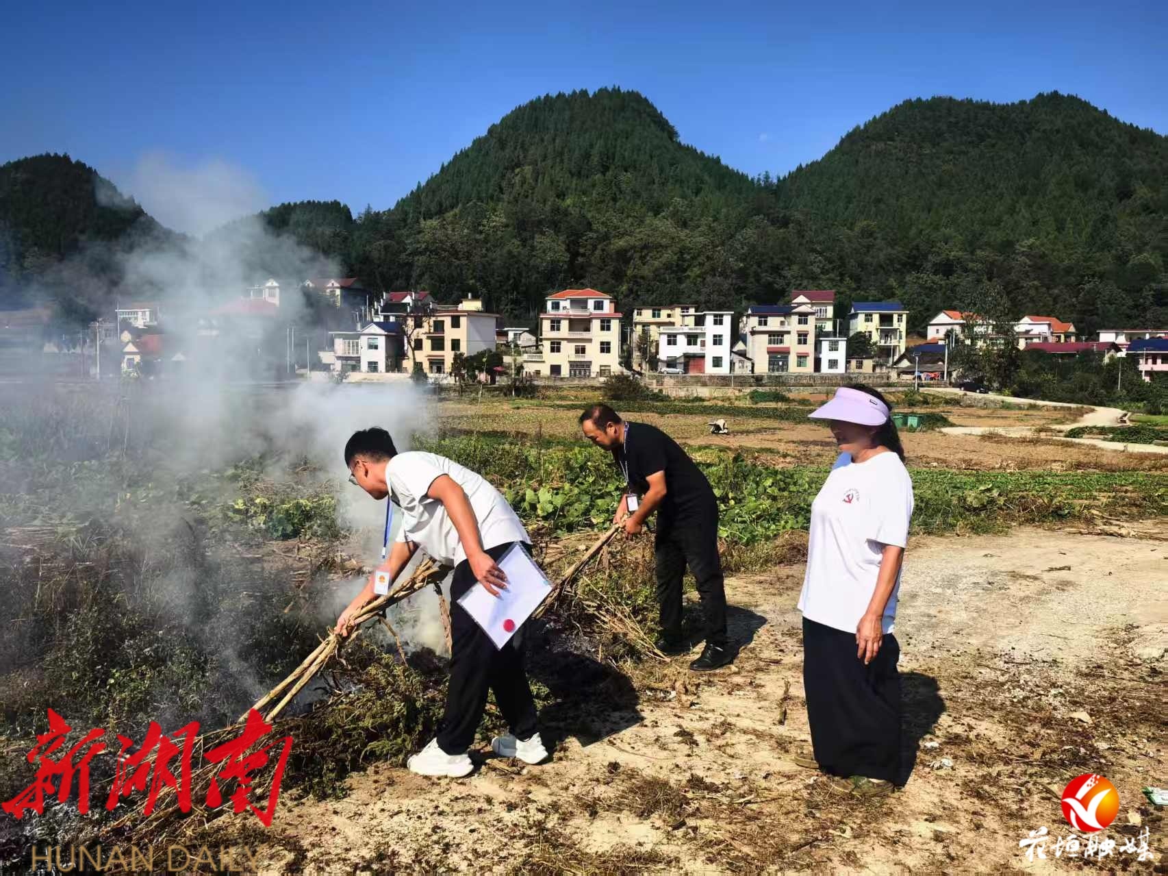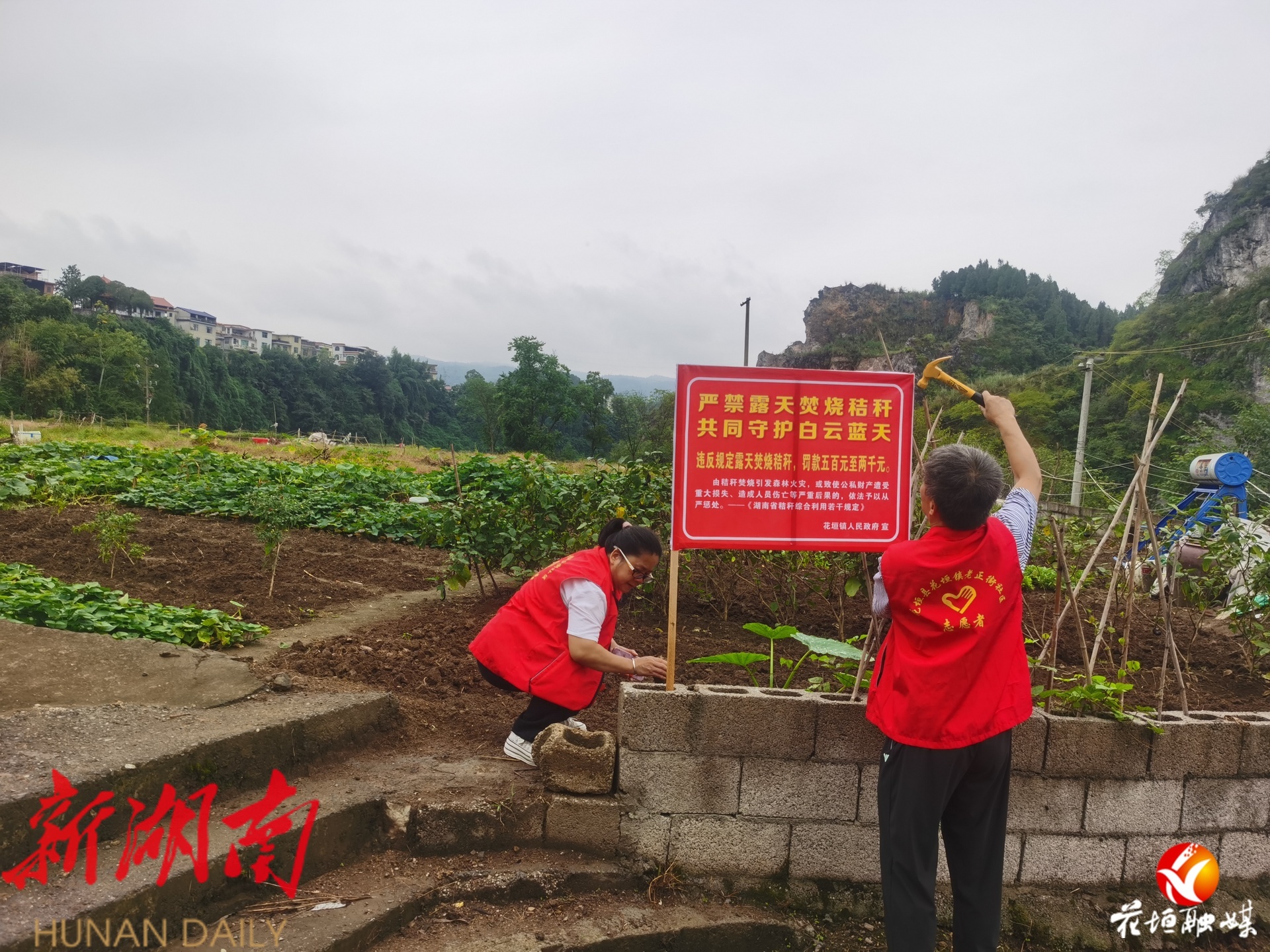 秸秆禁烧,宣传先行。花垣镇采取“线上+线下”相结合方式,广泛宣传秸秆利用的“好处”和秸秆焚烧的“弊端”,织密禁烧宣传网。线上,各村(社区)通过“村级为民群”累计推送禁烧科普、政策视频等200余条;线下,在田间设立警示牌,公开栏张贴《湖南省秸秆综合利用若干规定》,利用“村村响”播放相关政策,并组织干部结合乡村振兴、森林防火等工作开展“敲门行动”。