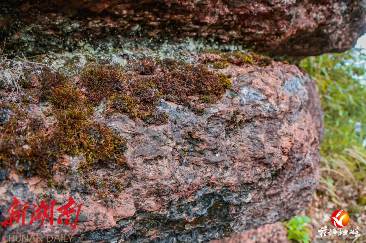 当天的天气比较湿润,我们能看到石头上生意盎然的苔藓,同时也注意到红石林具有沉积岩的特征,仔细观察还能看到一层层不断叠加的石层。