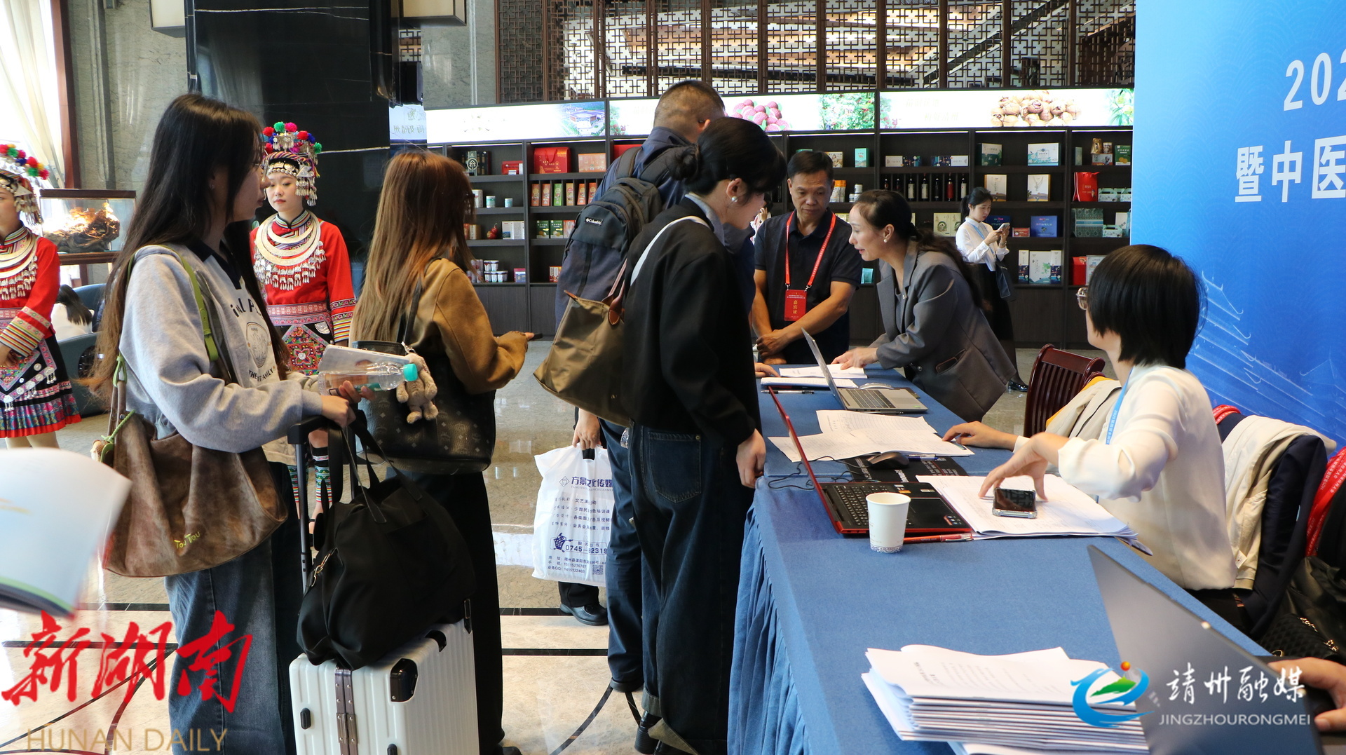 在和侬民族酒店大厅报到处,随处可见“靖州元素”。工作人员有序协助办理报到、酒店入住等事宜,并发放会议指南、资料汇编等物品。