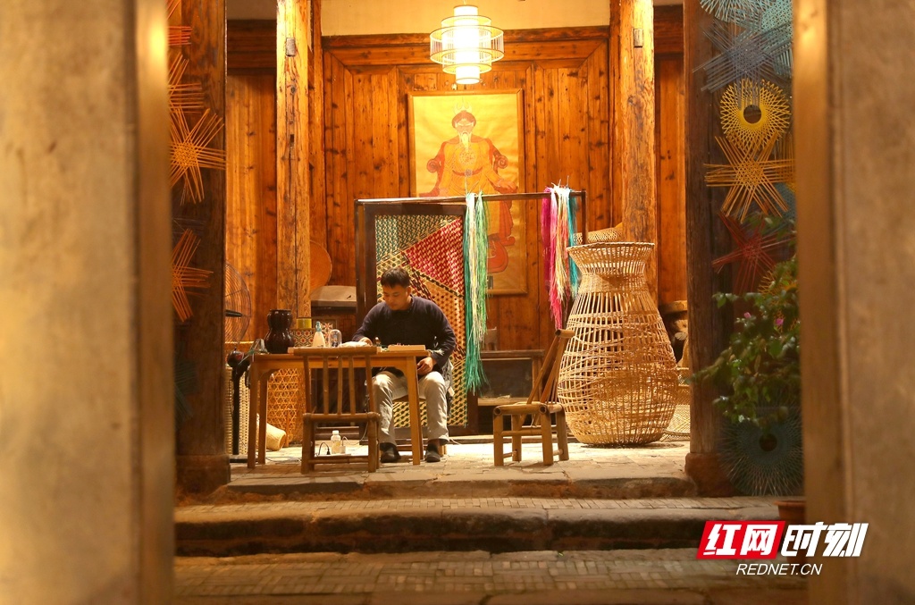 穿过青石巷,然翔园里的杨汉明,正对着手机屏幕展示非遗辰河棕编技艺。棕绳在他指间如游蛇般穿梭:“直播不是卖手艺,而是传文化。”身后的辰河棕编作品栩栩如生,是古城记忆的载体。