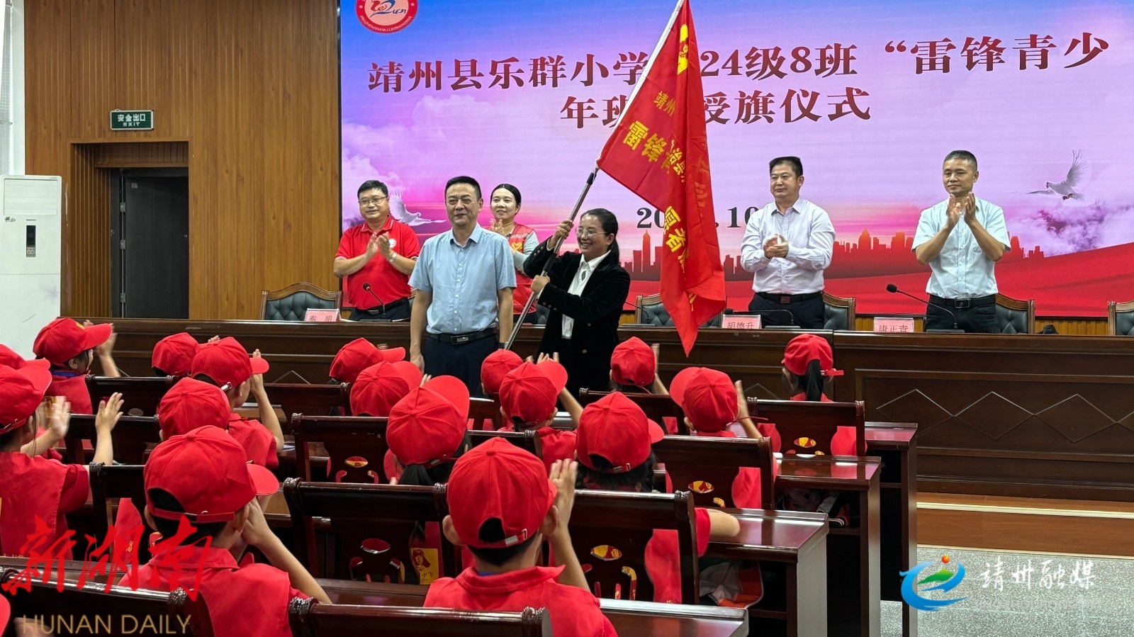 靖州融媒10月16日讯 (通讯员 吴顺全 黄透鹏)10月15日,靖州苗族侗族自治县新时代文明实践指导中心授予乐群小学2024级8班“雷锋青少年班”光荣称号,并举行授旗仪式。