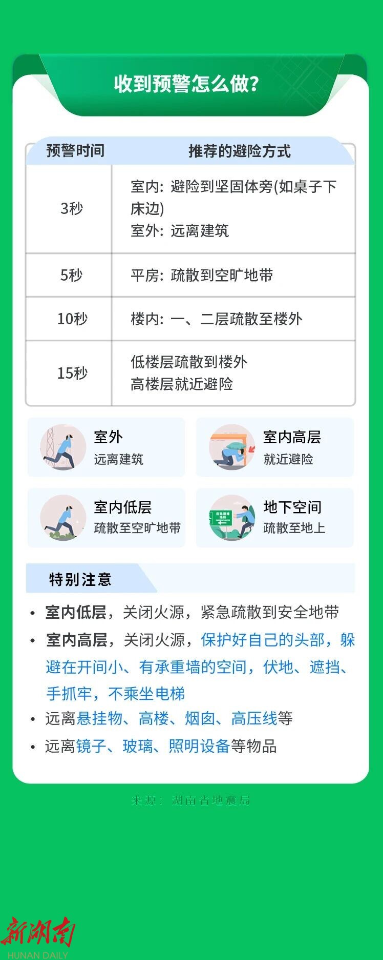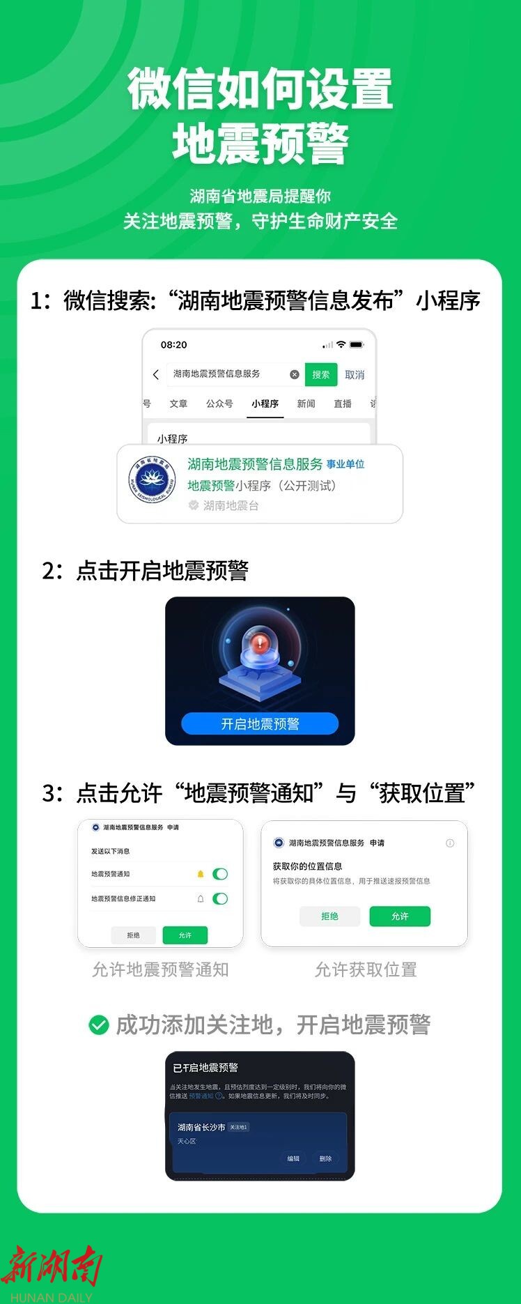 温馨提示 :公众可关注政府有关部门发布的权威信息,科学辨别、自觉抵制谣言传播。如需获取地震预警信息,可关注湖南地震台微信小程序,设置接收地震预警信息。