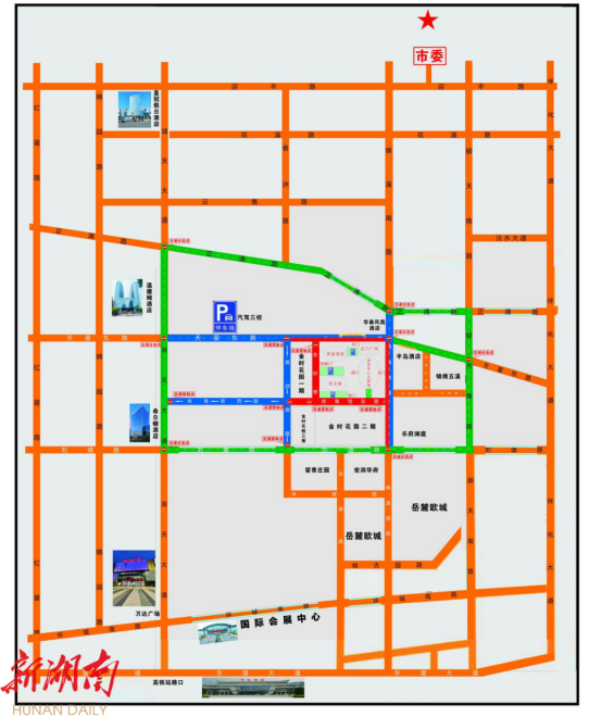 1、红色道路区域为核心管制区,除工作人员及演职人员车辆外,禁止车辆进入。