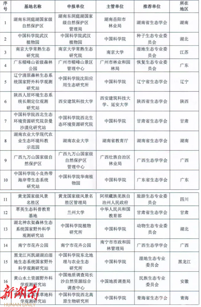 记者16日从湖南省生态环境厅获悉,中国生态学学会日前公布了2025年度“中国生态学学会生态科普教育基地”认定名单,湖南东洞庭湖国家级自然保护区、湖南农业大学现代农业生态环境科教示范园成功入选,湖南新添2个“国字号”生态科普名片。