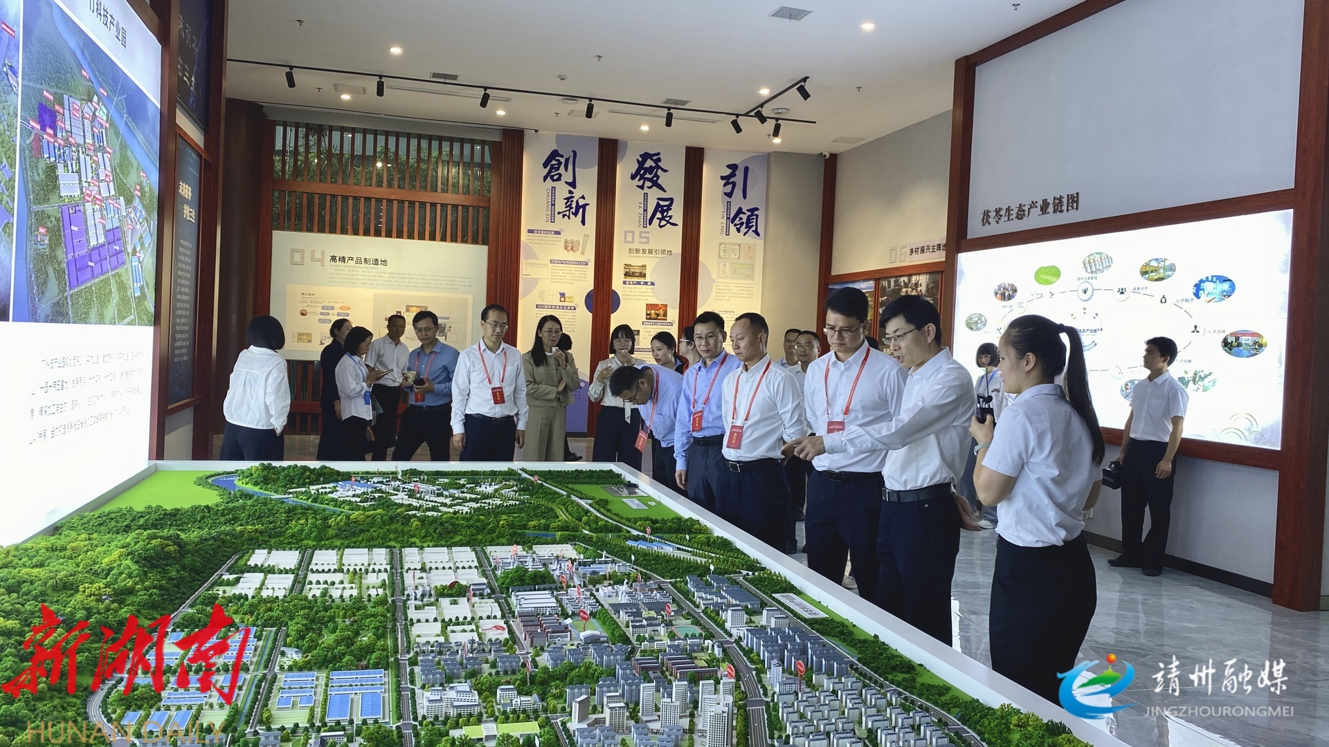 “院士专家怀化行走进靖州”调研考察团队正在观看茯苓科技产业园沙盘(张秦 摄)