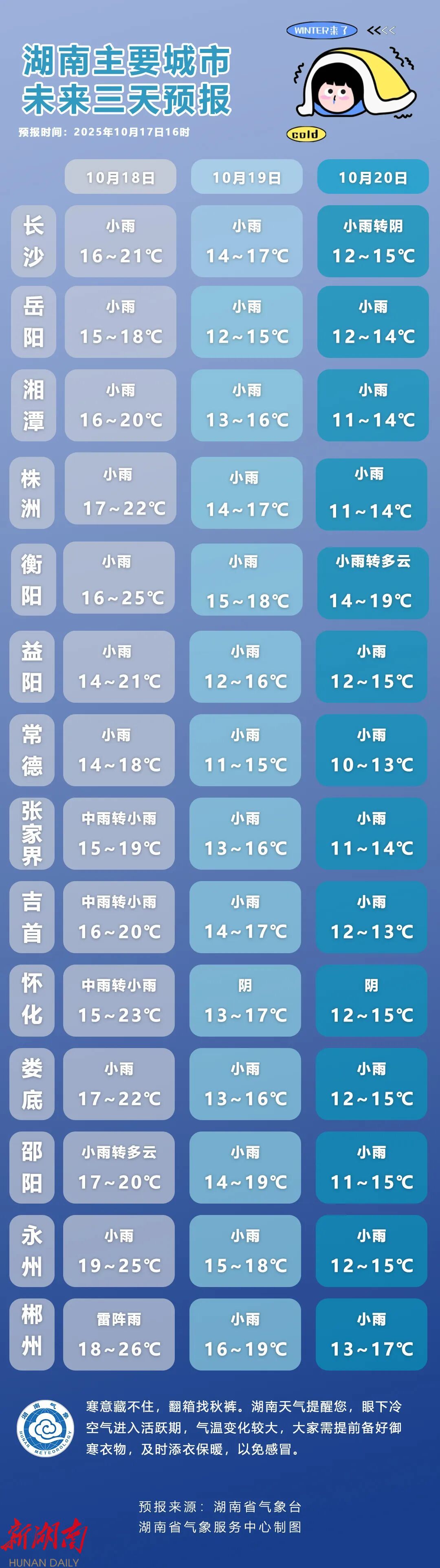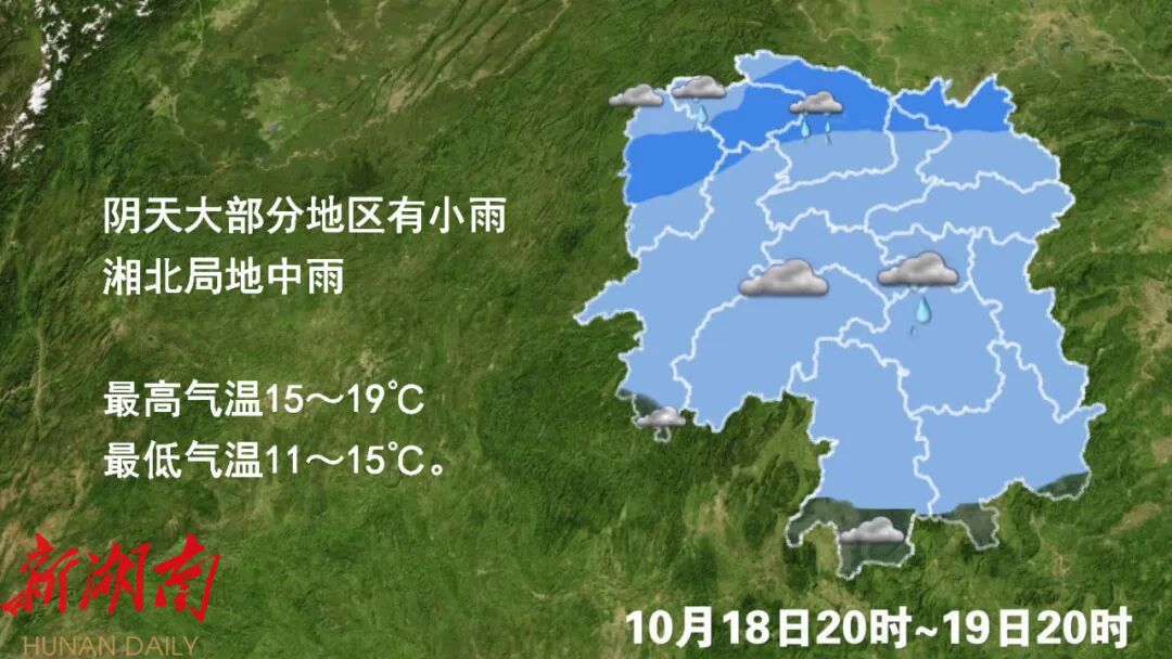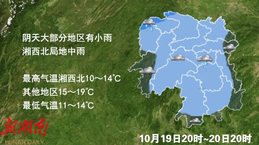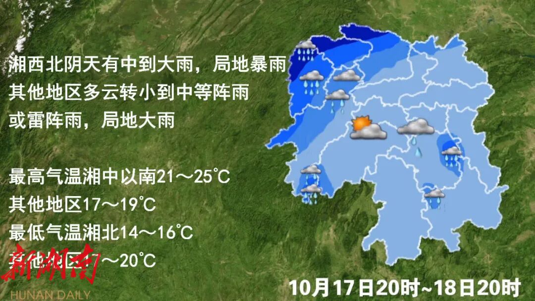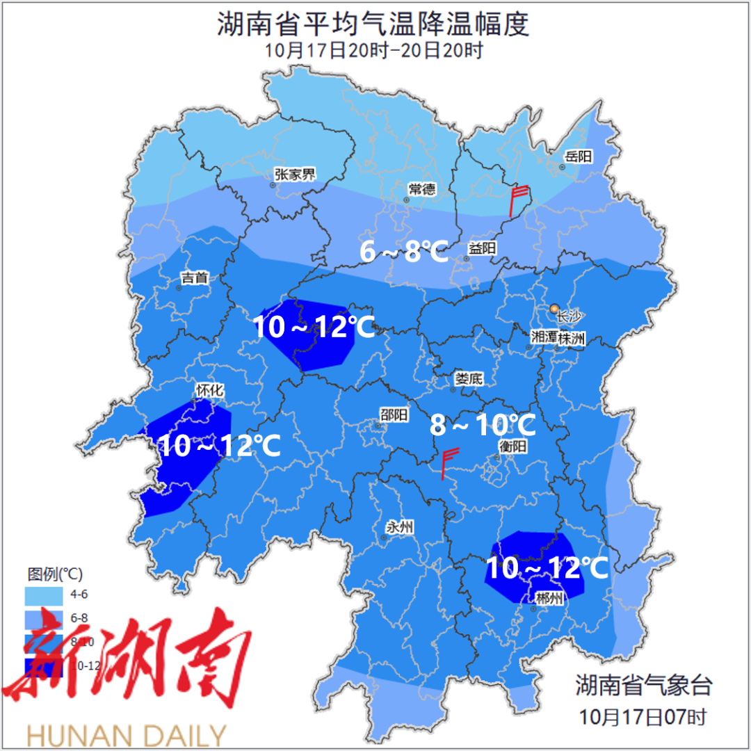 10月17日20时至20日20时湖南省平均气温降幅及大风预报图