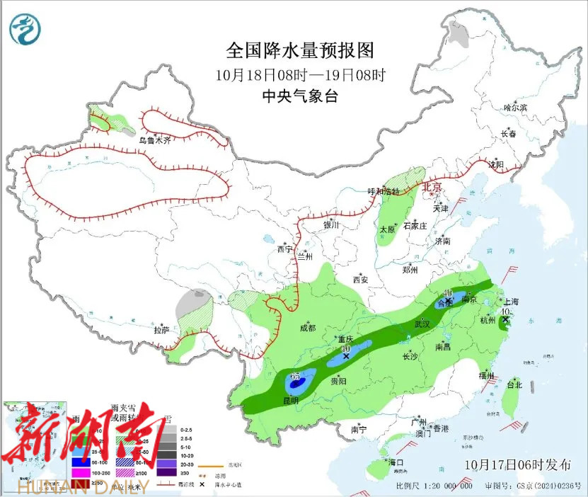昨天,西南地区东部到黄淮、江淮一带的降雨仍处于最强时段,多地出现大到暴雨。今天,雨带将逐渐南压并减弱。中央气象台预计,10月18日08时至19日08时,贵州北部、云南东北部等地部分地区仍有大雨,其中,云南东北部局地有暴雨。此外,东北的雨雪明显减少,新疆沿天山地区西部、西藏东北部、川西高原北部、内蒙古东北部和中部、河北西北部等地部分地区有小到中雪或雨夹雪。明天,我国大部的降水将进一步减少减弱,但华西一带会有明显降雨。