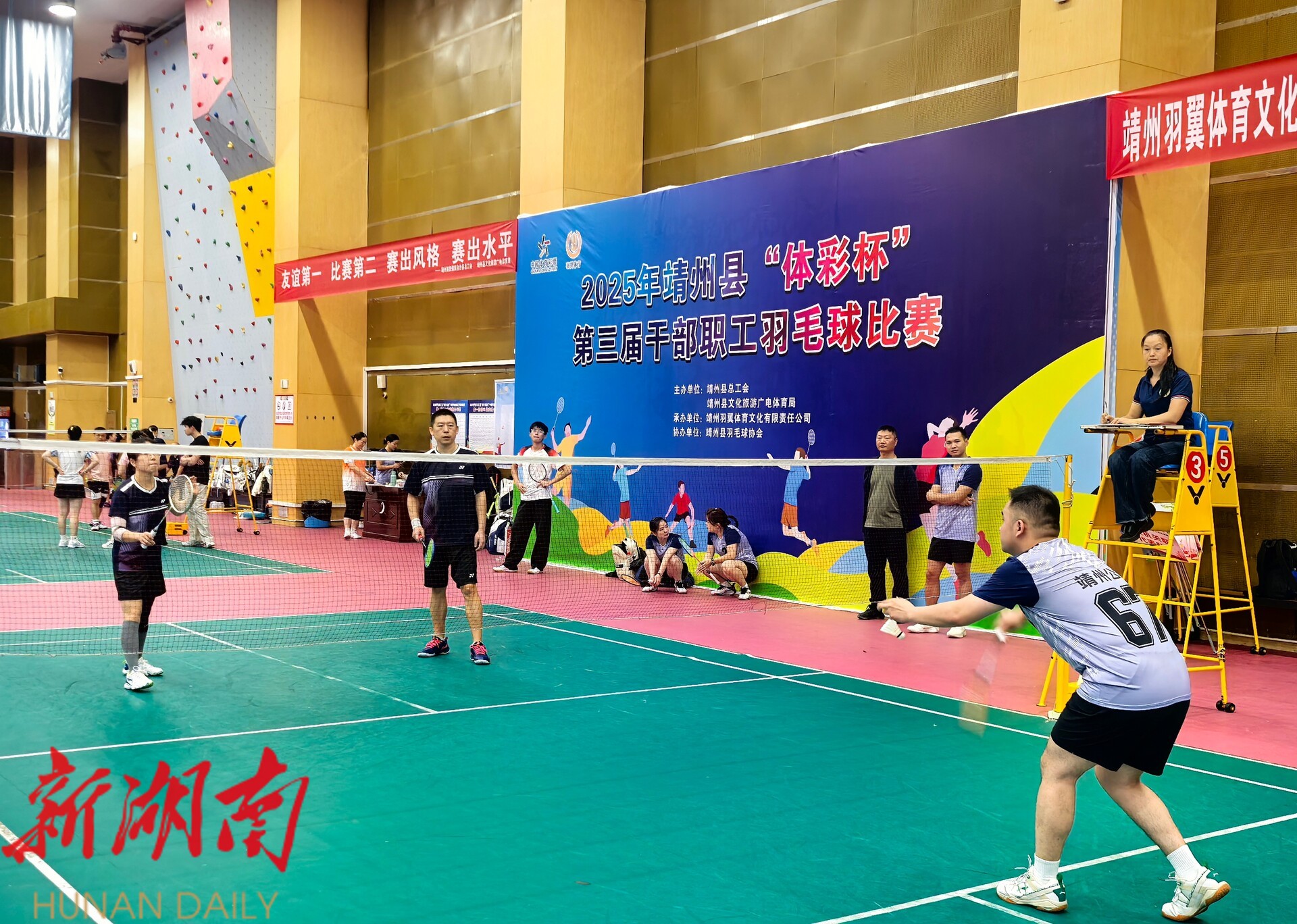 靖州融媒10月18日讯 (记者 周悦伊 通讯员 张书凡)10月18日,由靖州苗族侗族自治县总工会、县文化旅游广电体育局联合主办的2025年靖州“体彩杯”第三届干部职工羽毛球比赛,在民族体育馆开赛。党政机关联队、县人大代表队、县公安局队、县商科工信联队等17支代表队、100余名参赛选手齐聚一堂,以球会友,共展竞技活力。