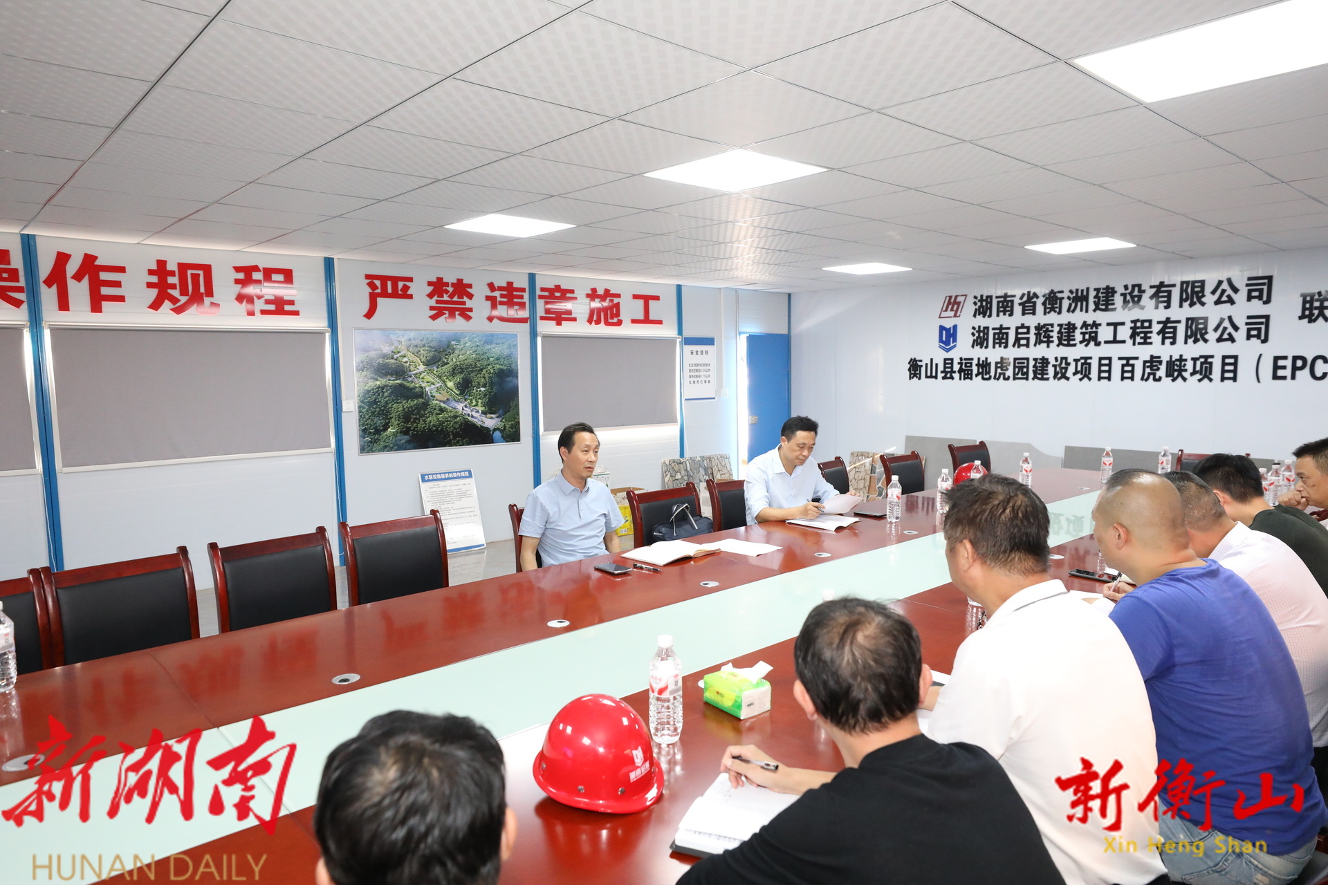 在福地虎园项目建设现场,戴新贤实地察看项目建设提升进展,听取项目负责人关于风貌设计、业态植入等情况汇报。戴新贤指出,当前,由衡山县承办的第三届衡阳市旅游发展大会已进入倒计时,福地虎园项目作为本届旅发大会的重要展示窗口,全体人员必须以临战状态,高标准、严要求圆满完成各项目标任务,确保项目如期优质建成。