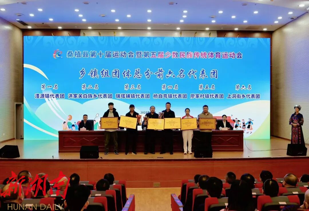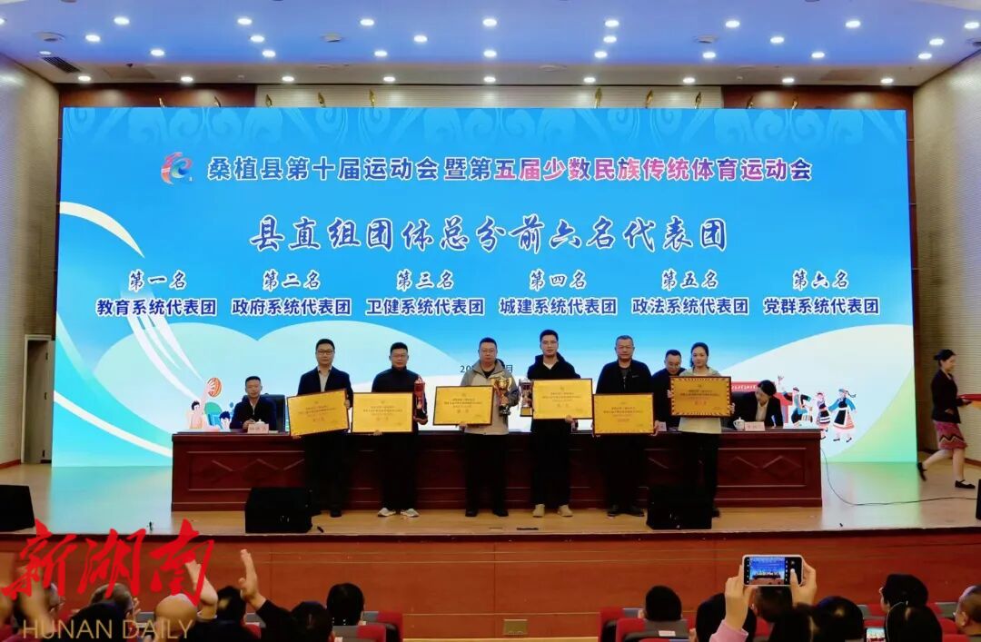 历时5天,全县34个代表团的3390名选手,完成了县直15个大项、乡镇17个大项的各项赛事,体现了桑植儿女奋勇拼搏、敢于争先的体育精神。闭幕式上,宣布了体育道德风尚奖获奖代表团名单和县直团体总分前6名、乡镇团体总分前12名名单,并进行了现场颁奖。其中,县直团体总分前三名分别是教育系统代表团、政府系统代表团、卫健系统代表团。乡镇团体总分前三名分别是澧源镇代表团、洪家关白族乡代表团、瑞塔铺镇代表团。