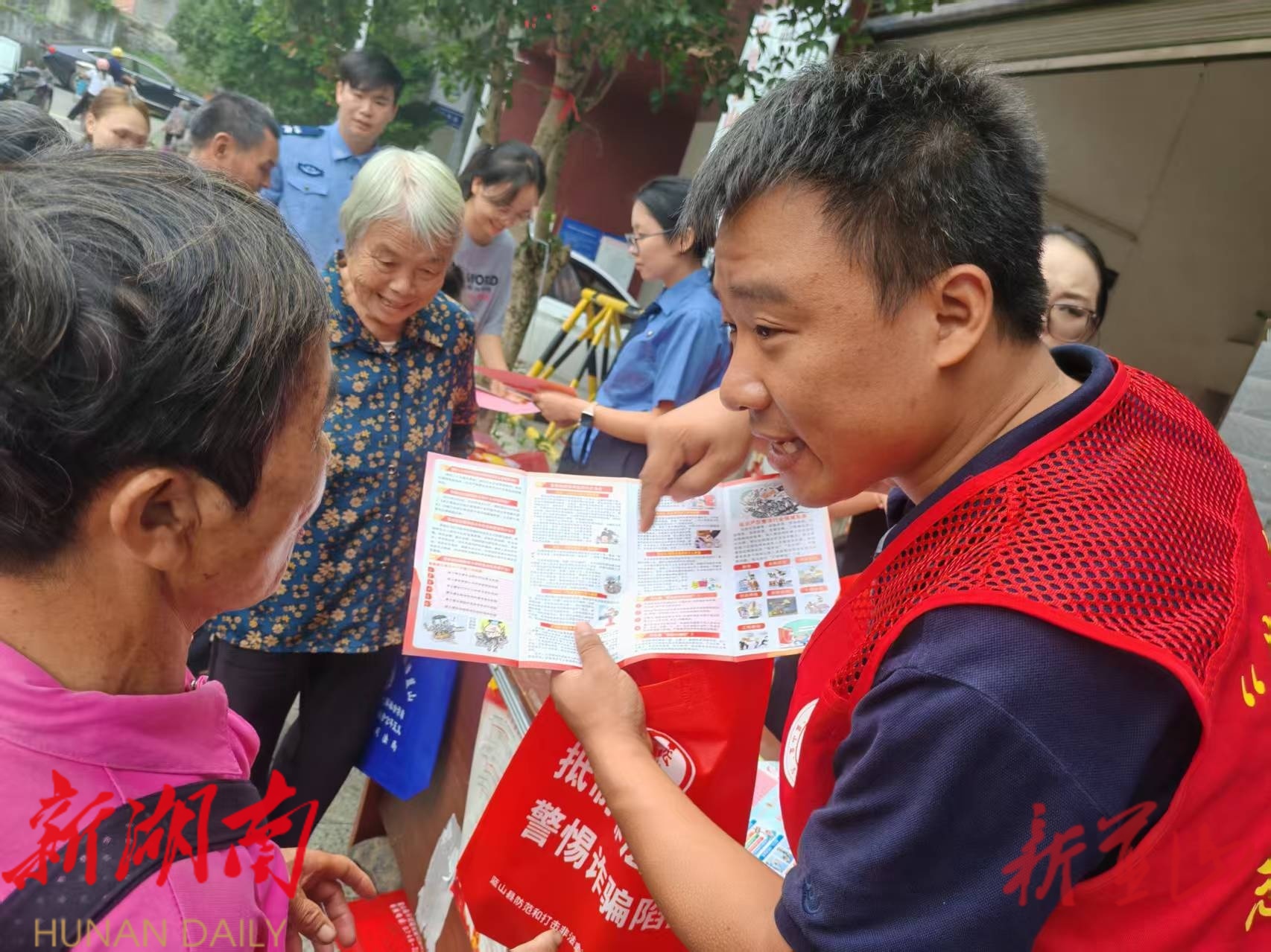 活动现场,工作人员通过悬挂横幅、摆放展板、发放宣传资料等方式,向赶集群众普及相关知识。在扫黑除恶宣传区,工作人员详细讲解黑恶势力的危害及举报方式,鼓励群众积极提供线索。禁毒宣传区展示了各类毒品模型,通过真实案例揭示毒品对个人、家庭和社会的危害。反电诈宣传区则重点剖析了近期高发的电信诈骗手法,提醒群众谨防上当受骗。