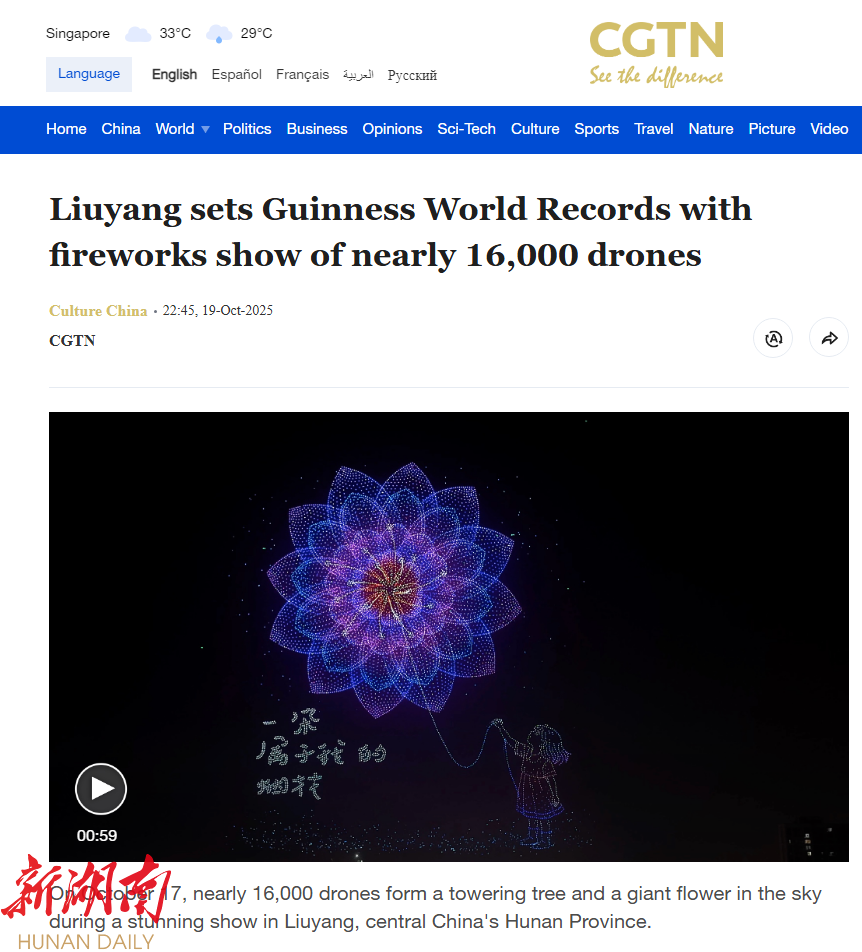 今天(10月20日),中国国际电视台(China Global Television Network)也以《Liuyang sets Guinness World Records with fireworks show of nearly 16,000 drones》(《浏阳16000架无人机烟花秀创造新的吉尼斯世界纪录》)