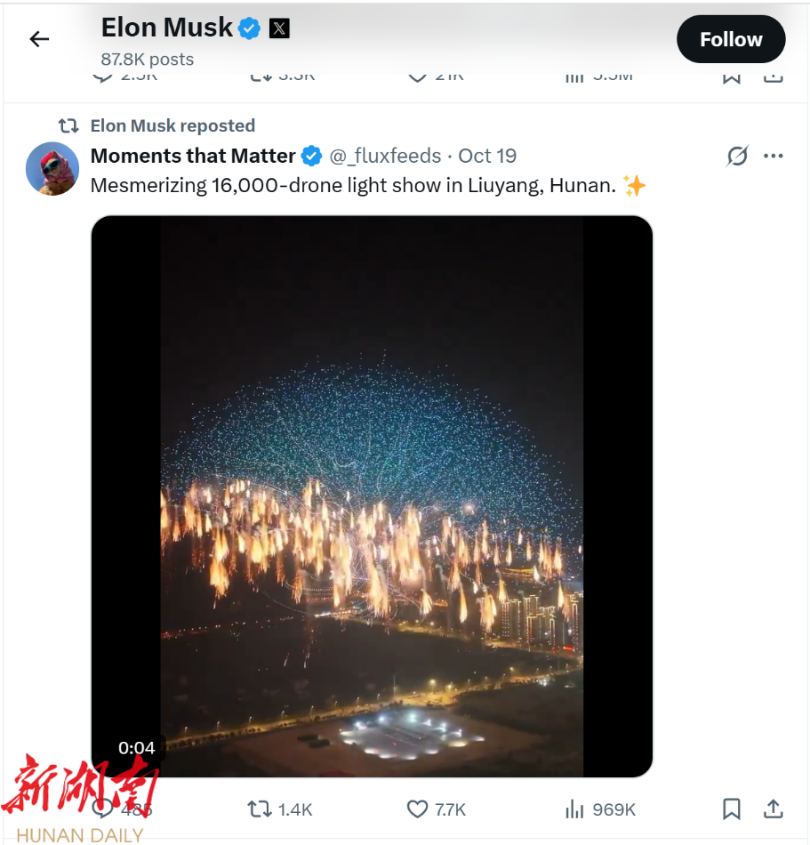 10月19日,特斯拉创始人兼首席执行官埃隆·马斯克(Elon Musk)在社交媒体平台推特上转发了“浏阳创意烟花与无人机共舞,打破吉尼斯世界纪录”的新闻,引发海外网友热评与关注。