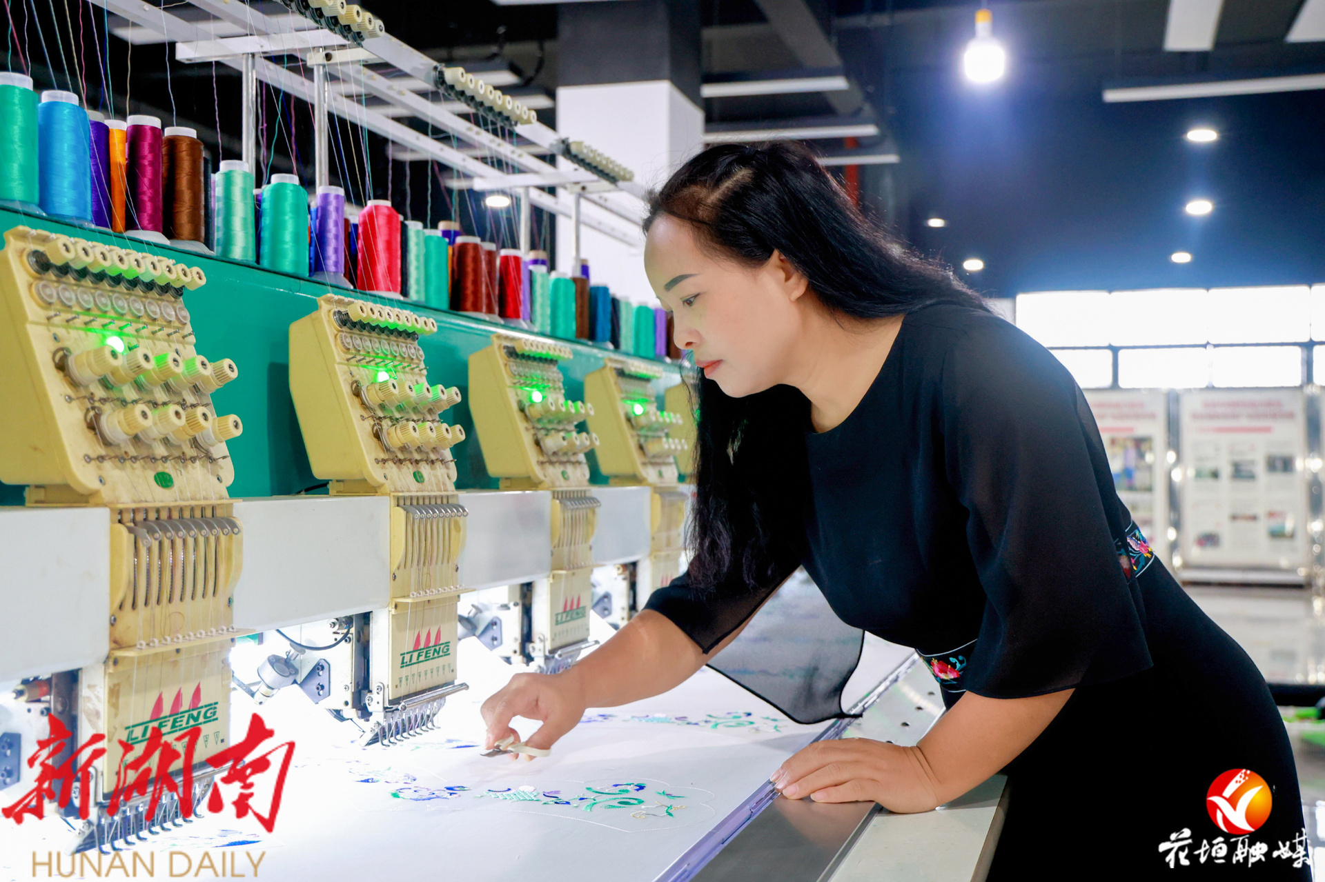 麻志银在查看机器绣制情况