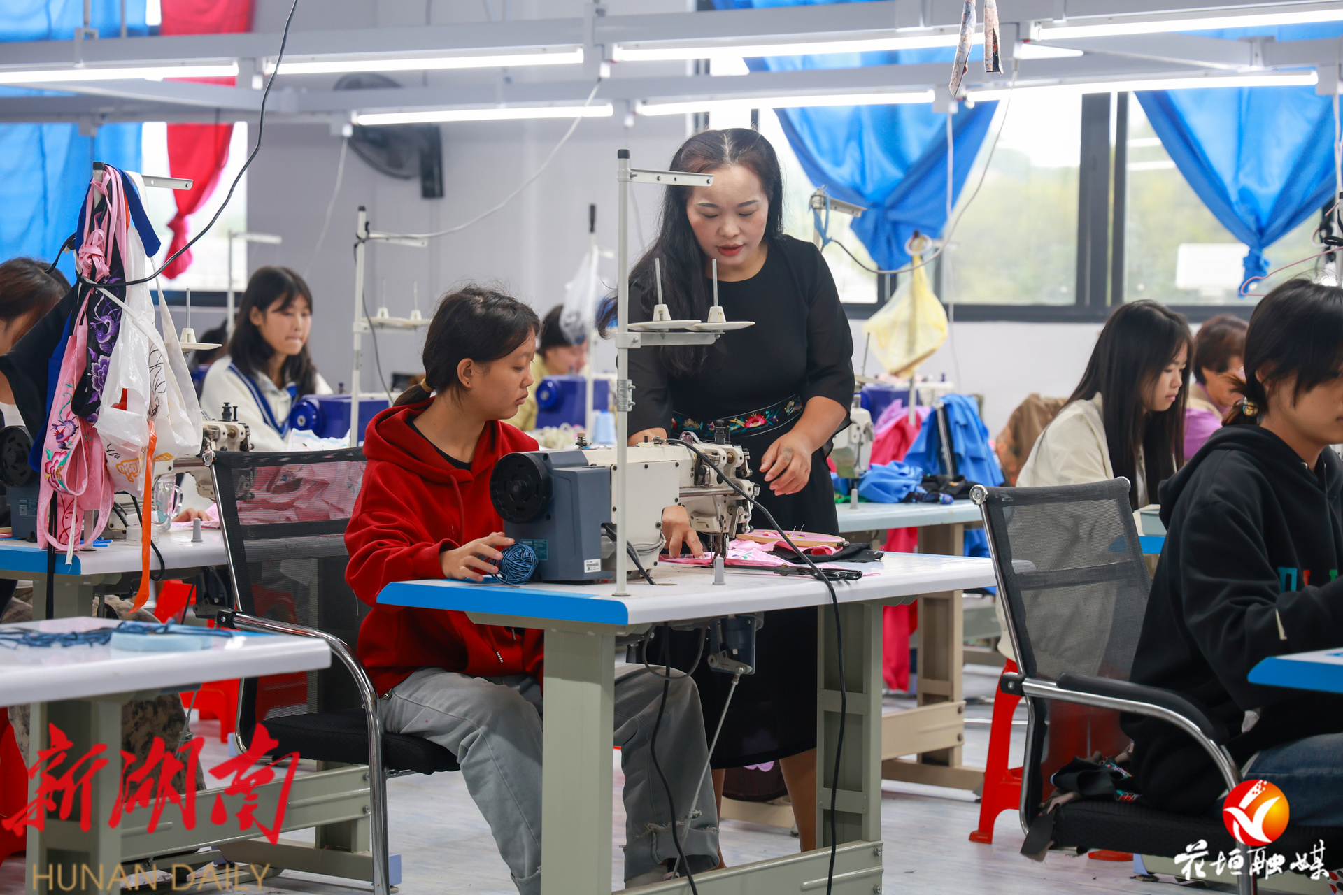 十月底的深秋,花垣县民乐镇湘西巧手翠翠贸易有限公司的生产车间里,绣娘们正全神贯注地赶制80套来自永顺县芙蓉镇的苗服订单。创始人麻志银轻轻拿起一件半成品,俯身仔细查看纹样细节。灯光下,绣娘们手中的银针在五彩丝线间来回穿梭,精准而灵动。