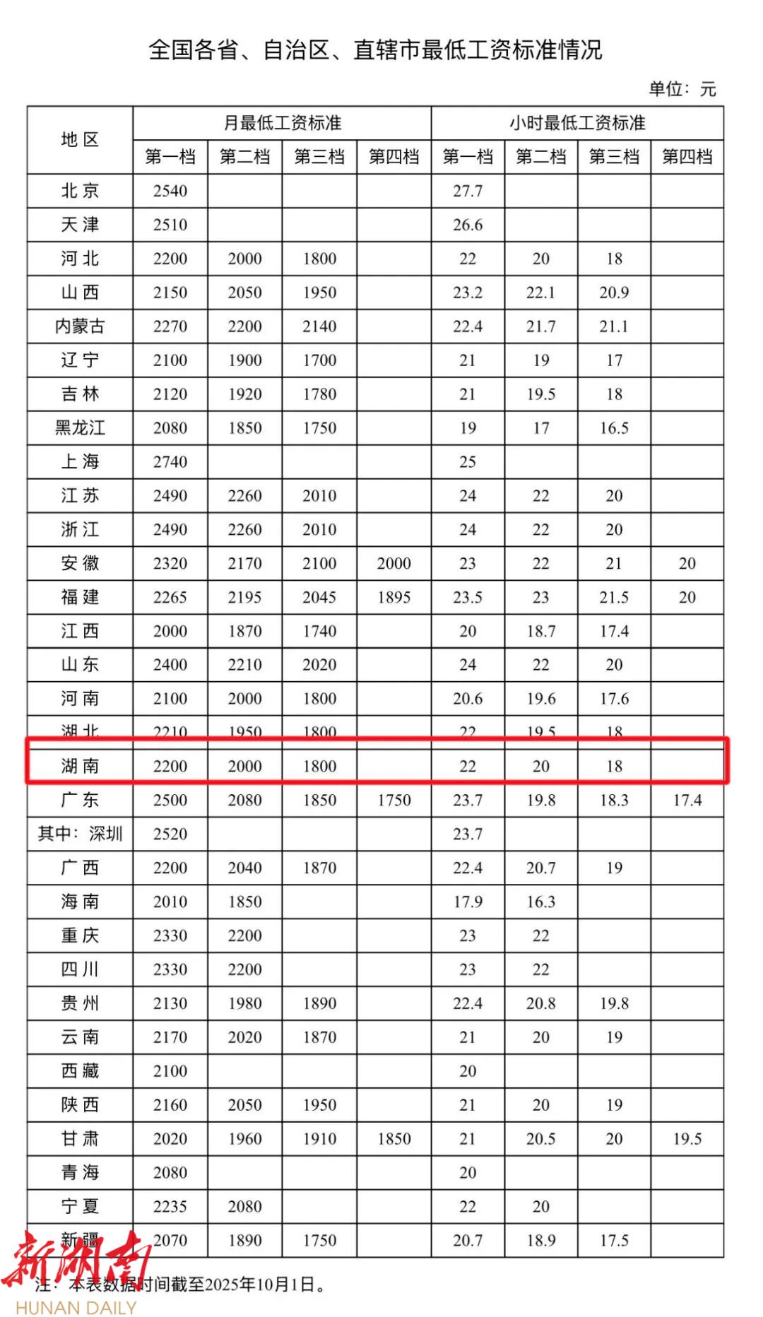 数据显示, 湖南 第一档月最低工资标准为2200元,第一档小时最低工资标准为22元。