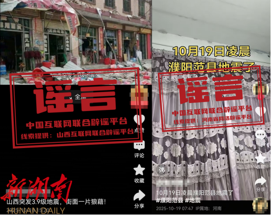 真相: 近日,有网民发布“山西突发3.9级地震,街面一片狼藉”的信息,引发关注。经当地相关部门核实,该信息与事实不符。中国地震台网测定,10月18日14时7分,山西省忻州市忻府区(北纬38.58度,东经112.50度)发生3.9级地震,震源深度10公里。省市相关部门派出现场工作队赴震中地区调查,本次地震未造成人员伤亡和财产损失,震区社会秩序正常。另有网民发布“10月19日凌晨,濮阳范县地震了”的信息,经范县防震减灾部门核实,该信息不实。(来源:“山西网络举报”微信公众号、河南省网络辟谣平台)