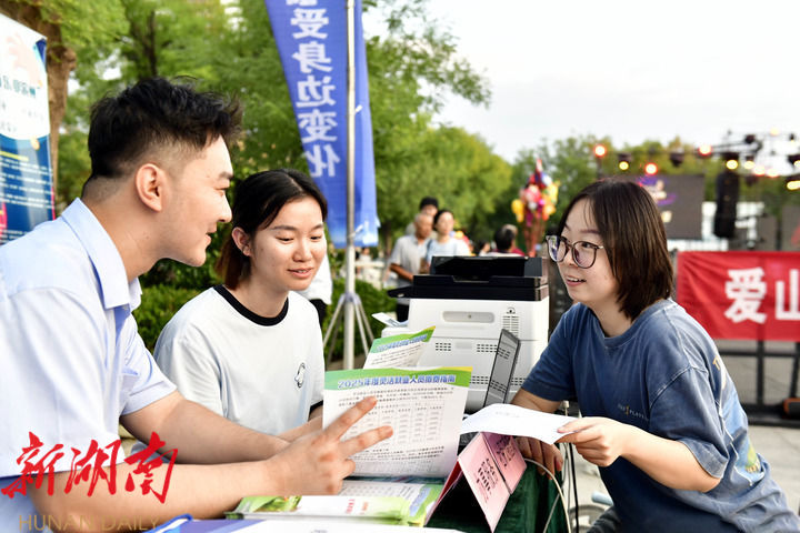 2025年8月25日,在山东省滨州市惠民县孙武广场,人社局的工作人员向市民介绍社保证明查询相关服务。新华社记者 郭绪雷 摄