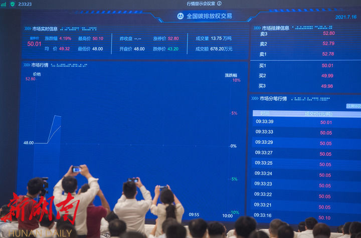 2021年7月16日在湖北武汉拍摄的全国碳排放权交易实时信息画面。新华社记者 肖艺九 摄