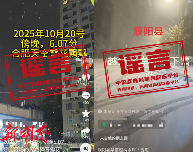 真相: 近期,多地迎来降温,网络上陆续出现“2025年10月20日傍晚合肥天空雪花飘飘”“安徽淮南下雪了”“河南濮阳下雪”等内容的视频,引发关注。经河南濮阳,安徽合肥、淮南等地气象部门核实,近期未监测到降雪情况,上述信息系谣言。(来源:河南省网络辟谣平台、@大皖新闻)