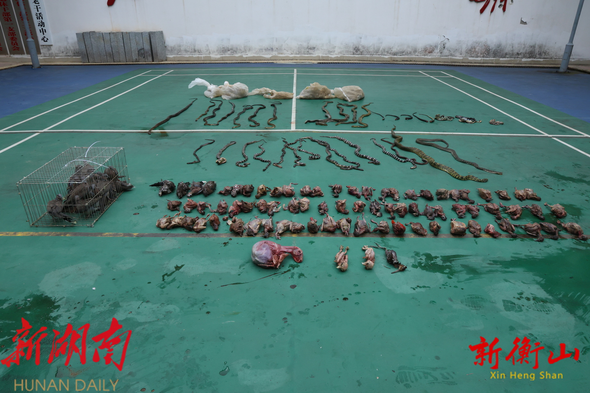 “现场查获活体野生动物包括活体斑鸠20只,活体蛇类17条。活体蛇类有21公斤,包括有大王蛇、乌梢蛇。嫌疑人家中还有大量的死体蛇类和死体鸟类。”衡山县森林公安局民警唐洪告诉记者。