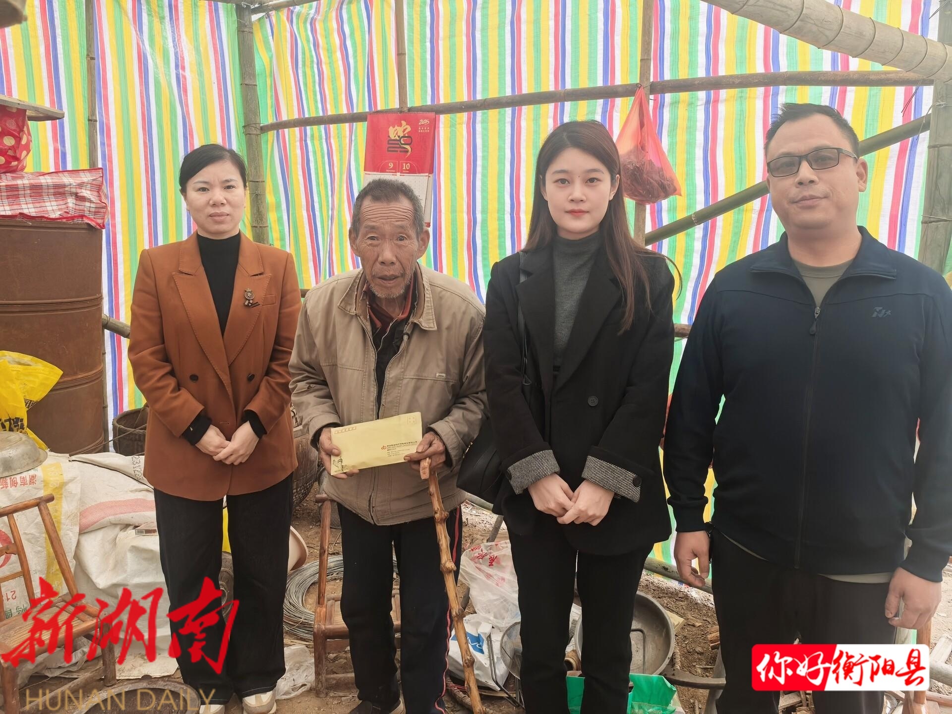 王春生老人年事已高,生活条件较为困难。慰问过程中,中华保险衡阳县支公司负责人王艳婕在我镇工作人员的陪同下,与老人亲切交流,详细了解其身体状况与生活需求,并郑重将慰问金递至老人手中,叮嘱其保重身体、乐观生活。老人接过慰问金后感动不已,现场氛围温馨融洽。