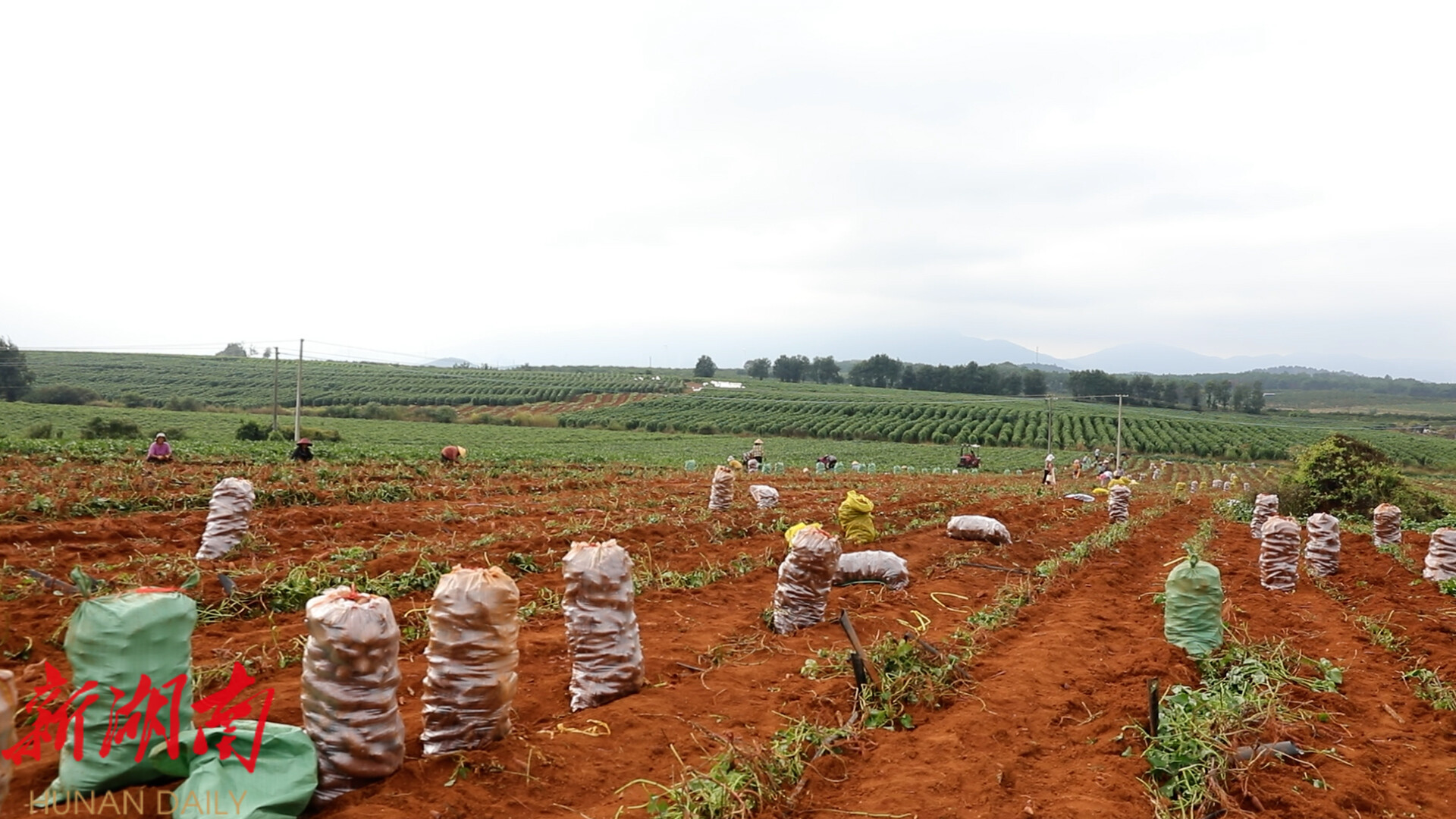 在红薯种植基地,种植户欧阳江春与省农科院及市、县老专家一起忙于查看收获情况的同时,工人们忙着采挖饱满鲜亮的红薯。 今年,他在老专家全程指导下规模化种植110亩新品种紫薯。通过精准用药和科学管理,不仅有效防治了病虫害,还节省了20%的农药成本,亩产高达5000斤,预计总产值超85万元。