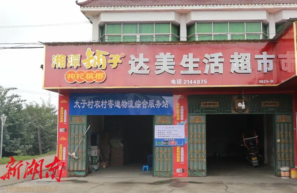 在聂家桥乡太子村寄递物流综合服务站,工作人员正在房屋顶部安装监控设施,并确定站点内其他设施安装情况。该服务站依托当地一家商店成立,虽规模不大,但公示公告牌、寄件扫描设备、打印机、应急设备等配置齐全。