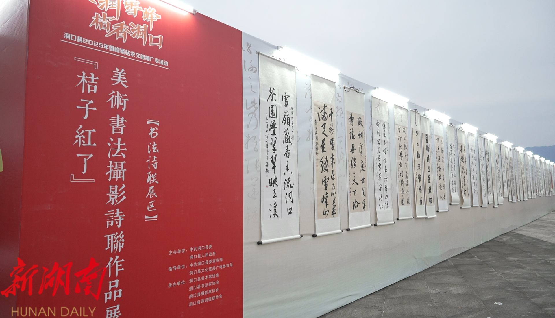 文化长廊:诗书画影绘桔韵,笔墨丹青诉乡情。 走进文化长廊, 美术、书法、摄影、诗词、楹联作品展精彩呈现,100多件优秀作品从不同视角展现了雪峰蜜桔的生长风貌、洞口的山水风光与乡村丰收的热闹场景。油画中金黄的桔园与远山相映成趣,摄影作品里果农采摘蜜桔的笑容真挚动人,诗词楹联则以凝练的文字勾勒出 “雪峰叠翠藏金桔,洞口含春蕴果香” 的绝美意境。