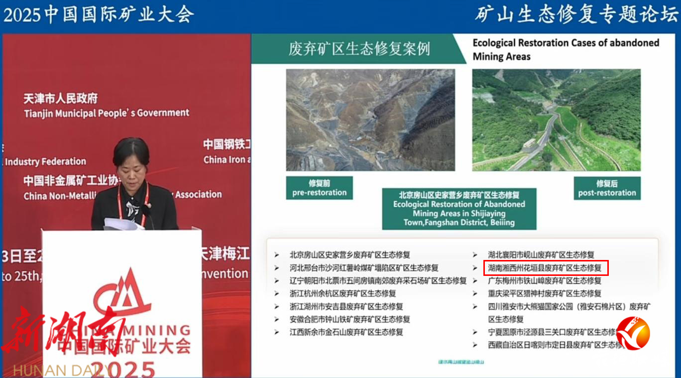 湖南日报·新湖南客户端10月25日讯(通讯员 田海峰)10月24日,第二十七届中国国际矿业大会“矿山生态修复专题论坛”在天津举行。论坛上,自然资源部发布了矿山生态修复典型案例,花垣历史遗留矿山生态修复成功入选并获推荐。