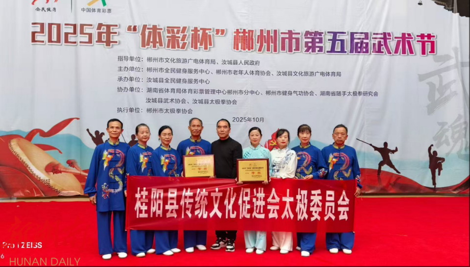 新桂阳10月27日讯(通讯员 李芳红 张爱民 )10月26日,“体彩杯”郴州市第五届武术节在汝城县全民健身中心圆满落幕,来自全市11个县市区共 800余名武术爱好者参加了本届武术节赛事活动。桂阳县老年体协代表队8位县传统文化促进会太极会员参加比赛,并获得三金、四银、两铜的好成绩。