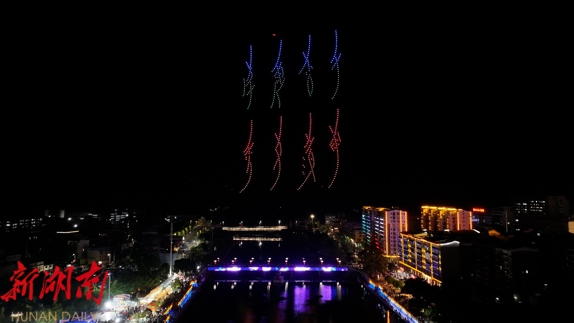 江永融媒10月27日讯(记者 毛磊 陈丽华 唐宇) 10月24日至26日,江永县滨河广场上空,数百架无人机以天为幕,在特色农产品推介会暨非物质文化遗产美食节期间连续上演星空大秀,将神秘“女书”文化、浓郁瑶族风情与“湘超永州”足球精神绘入夜空,为市民游客带来震撼心灵的视听盛宴。