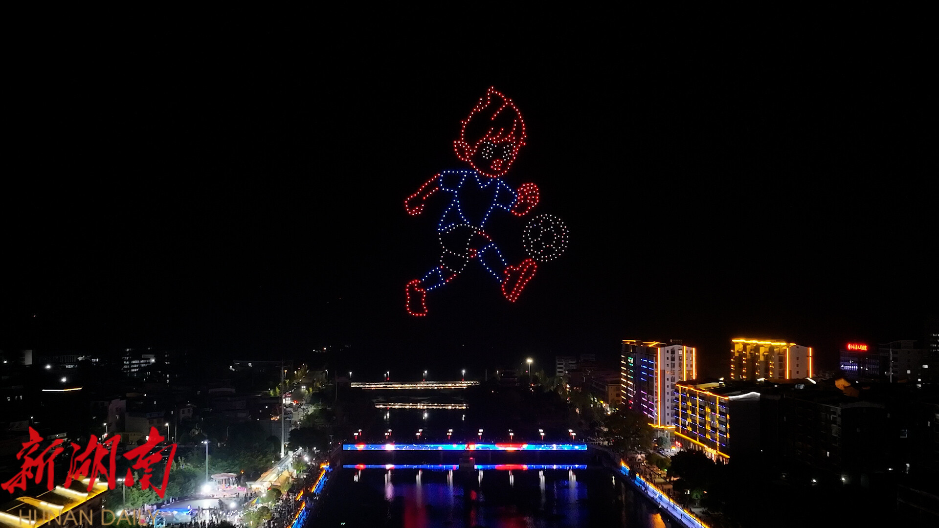 夜空中,数百架无人机腾空而起,依次点亮娟秀的女书字符、绚秀的瑶族图腾等图案,随后“湘超永州”“永州队晓了显火”等字样与绿茵场奔跑球员形象跃然夜空,科技光影与本土文化碰撞出震撼视觉效果。