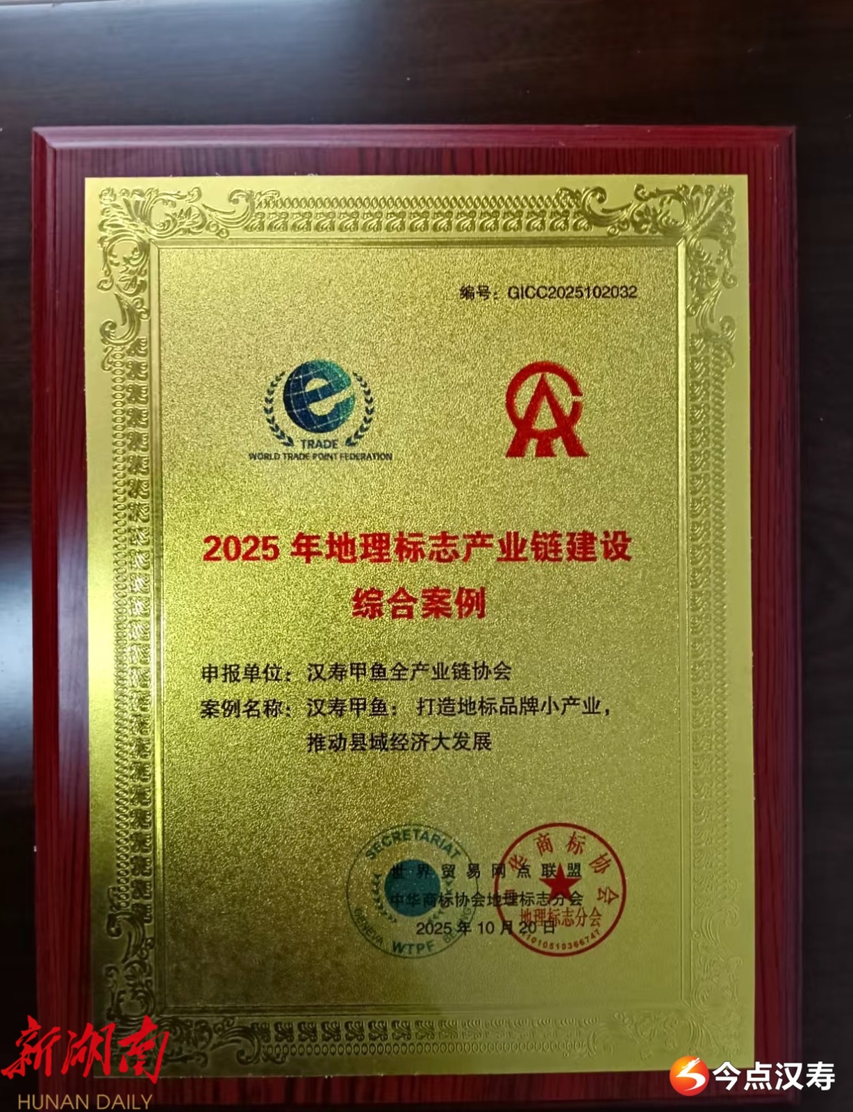 汉寿融媒10月28日讯(通讯员:席文雅)在近日召开的第十届世界地理标志品牌分销服务大会暨2025地理标志产业发展年会上, “汉寿甲鱼”凭借“双地标”支撑的品质基础、全链条发展的产业格局以及显著的富民成效,成功入选“2025年地理标志产业链建设综合案例”。此次入选,是汉寿县以创建省级地理标志产品保护示范区为牵引,推动现代化水产产业体系建设的生动实践,标志着该县以地理标志赋能特色水产高质量发展的举措获得全国行业权威认可。