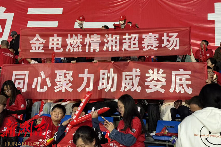 湖南日报·新湖南客户端10月27日讯 (通讯员 金轩)日前,“湘超”联赛娄底赛场人声鼎沸、呐喊震天,由大唐华银金竹山发电公司60余名职工、家属及统战人员代表组成的“金电燃情湘超赛场 同心聚力助威娄底”观赛团,身着统一服装,手持助威道具,成为看台上一道亮眼的风景线。