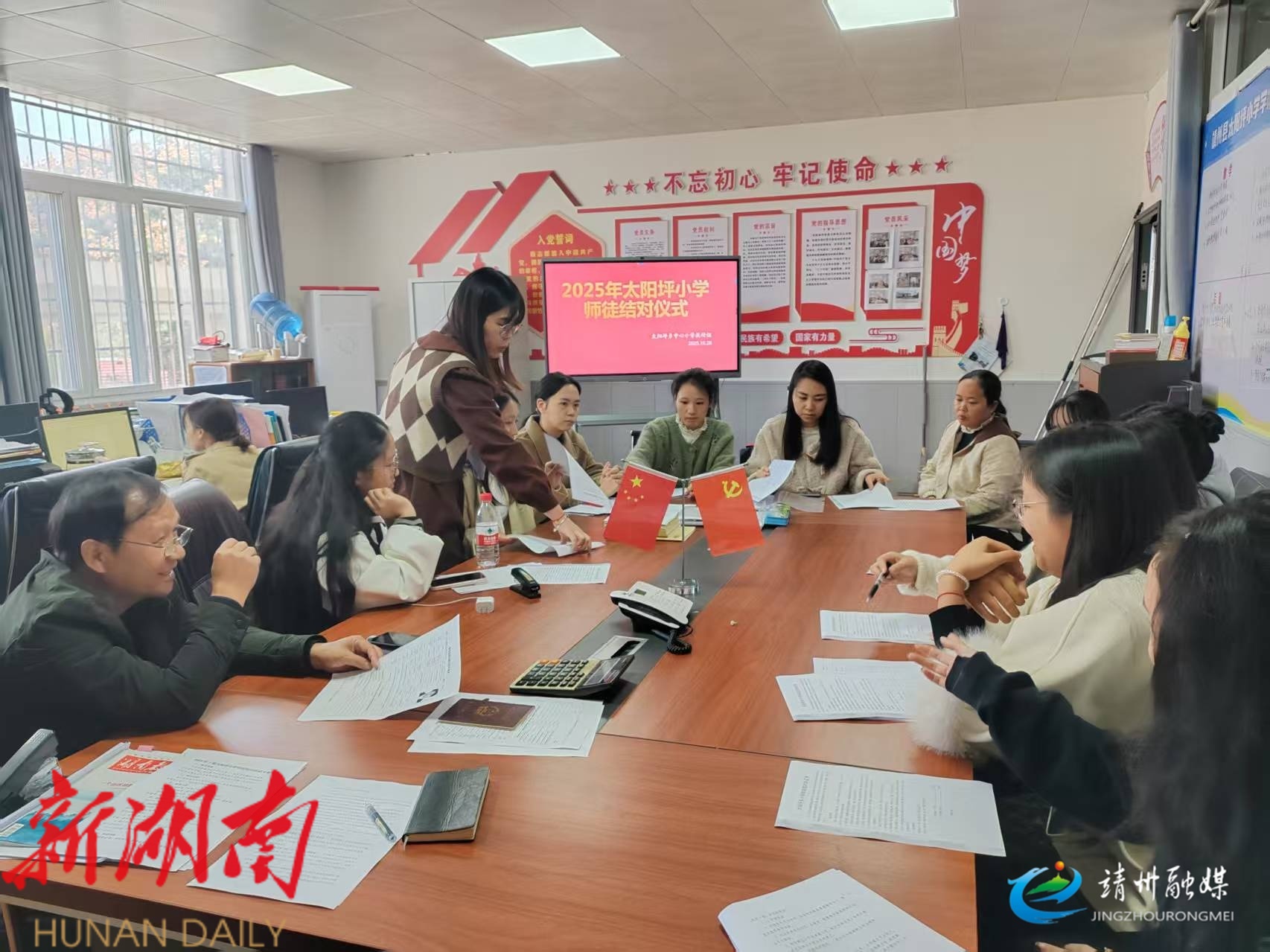 靖州融媒10月28日讯 (通讯员 杨露青 贾羽 胡佳琪 吴娇 梁靖 )10月28日,靖州苗族侗族自治县太阳坪乡中心小学开展“党建引领 师徒结对”活动。
