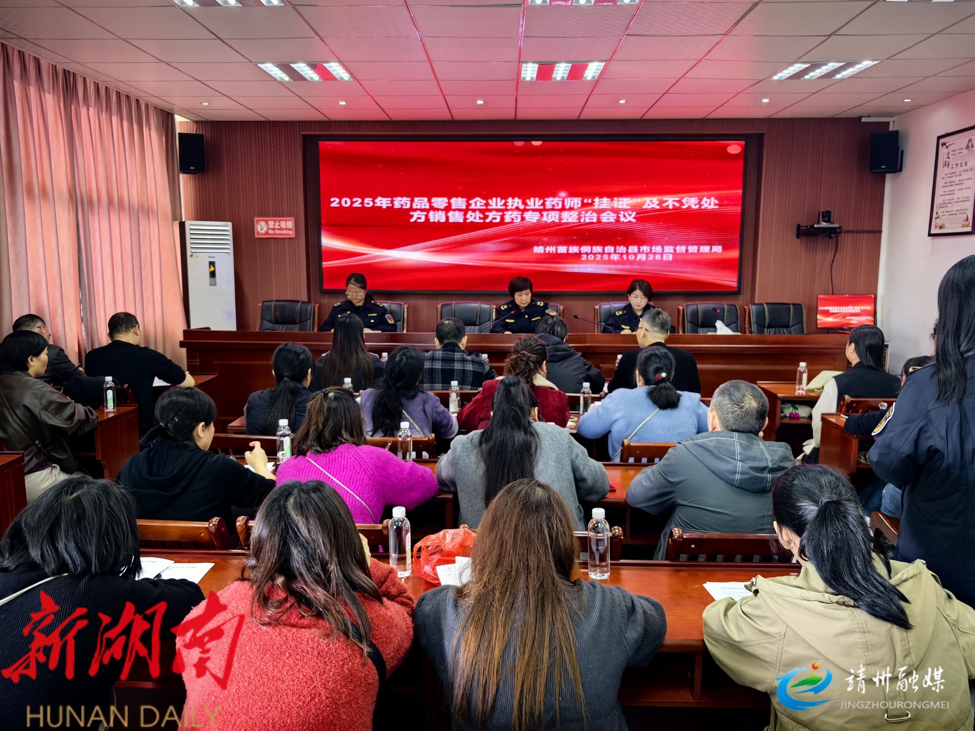 靖州融媒10月29日讯 (记者 周悦伊 通讯员 李欣蓓)10月28日,靖州苗族侗族自治县市场监督管理局组织召开2025年药品零售企业执业药师“挂证”及不凭处方销售处方药专项整治会议,对药品零售领域违法违规行为重拳出击。