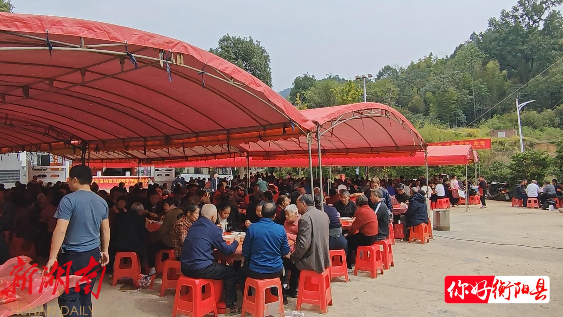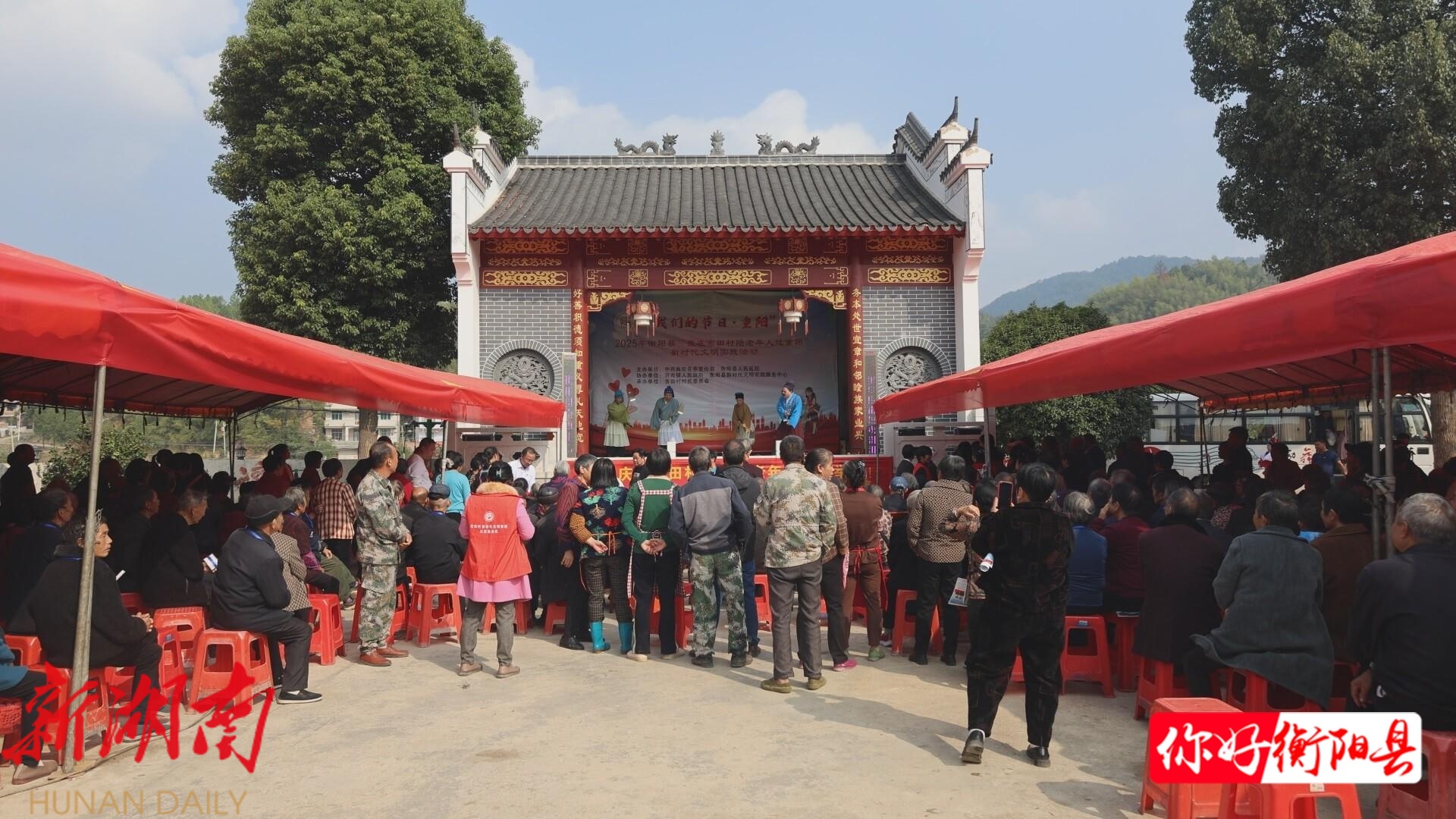 在洪市镇市田村, 志愿者为老人们献上了一场精彩的文化盛宴。韵味醇厚的衡阳花鼓戏选段,妙趣横生的小品表演,打动人心的深情独唱等一个个精心编排的节目轮番登场,引得台下老人阵阵掌声和欢声笑语。到了中午时分,80桌重阳宴正式开餐,美味可口的菜肴让老人们在享受精神文化的同时,也品尝到舌尖上的温暖,现场洋溢着浓厚的节日氛围。