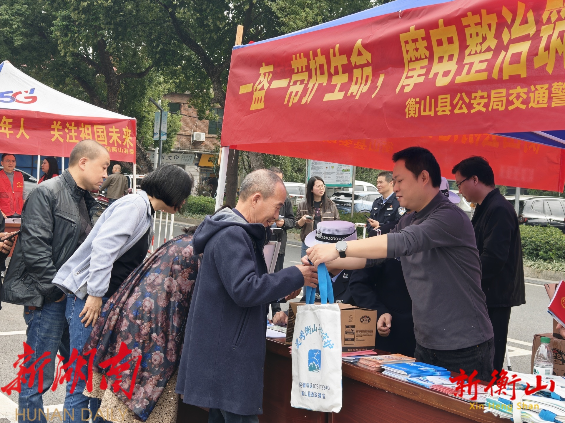 活动现场,印有“弘扬法治精神,共建平安衡山”“关爱未成年人,关注祖国未来”“扫黑除恶扬正气,平安建设齐参与”等横幅迎风招展,营造出浓厚的宣传氛围。工作人员向来往群众发放了精心编制的摩电整治、爱路护路、利剑护蕾、反邪教、国家安全、平安建设民调、反电信网络诈骗等宣传手册和宣传单,并现场发放安全头盔等一系列安全“周边”纪念品,向群众耐心普及平安建设知识。