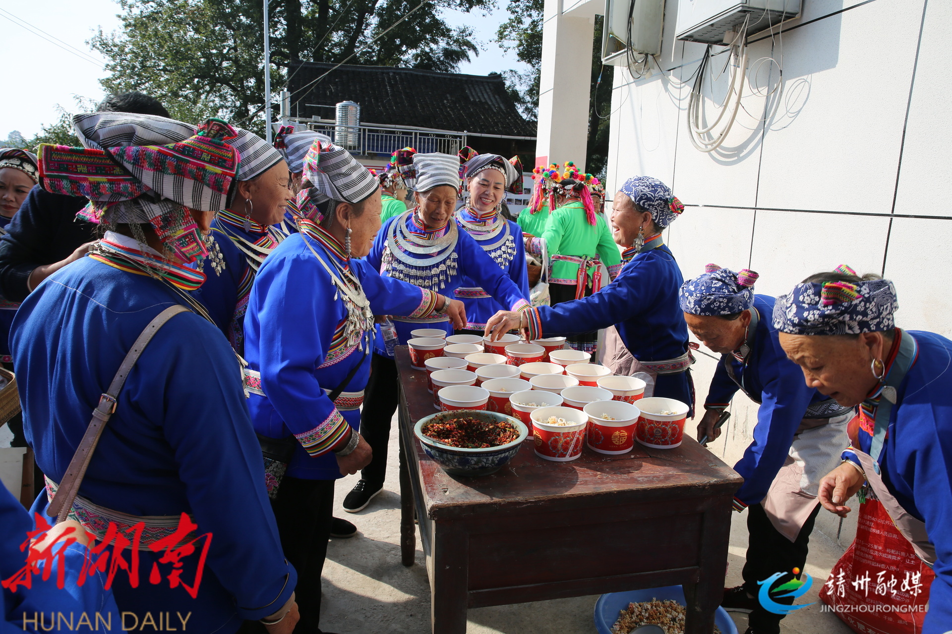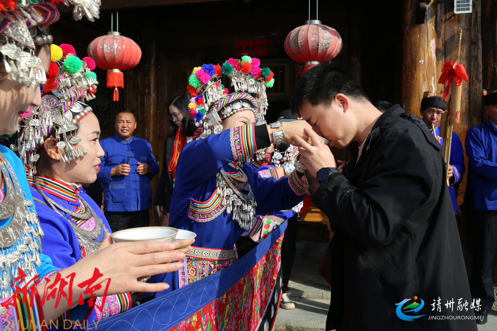 “九月开好桂花香,桂花开好客人来……”身着盛装的村民手捧酒碗唱着拦门歌,迎接宾客。
