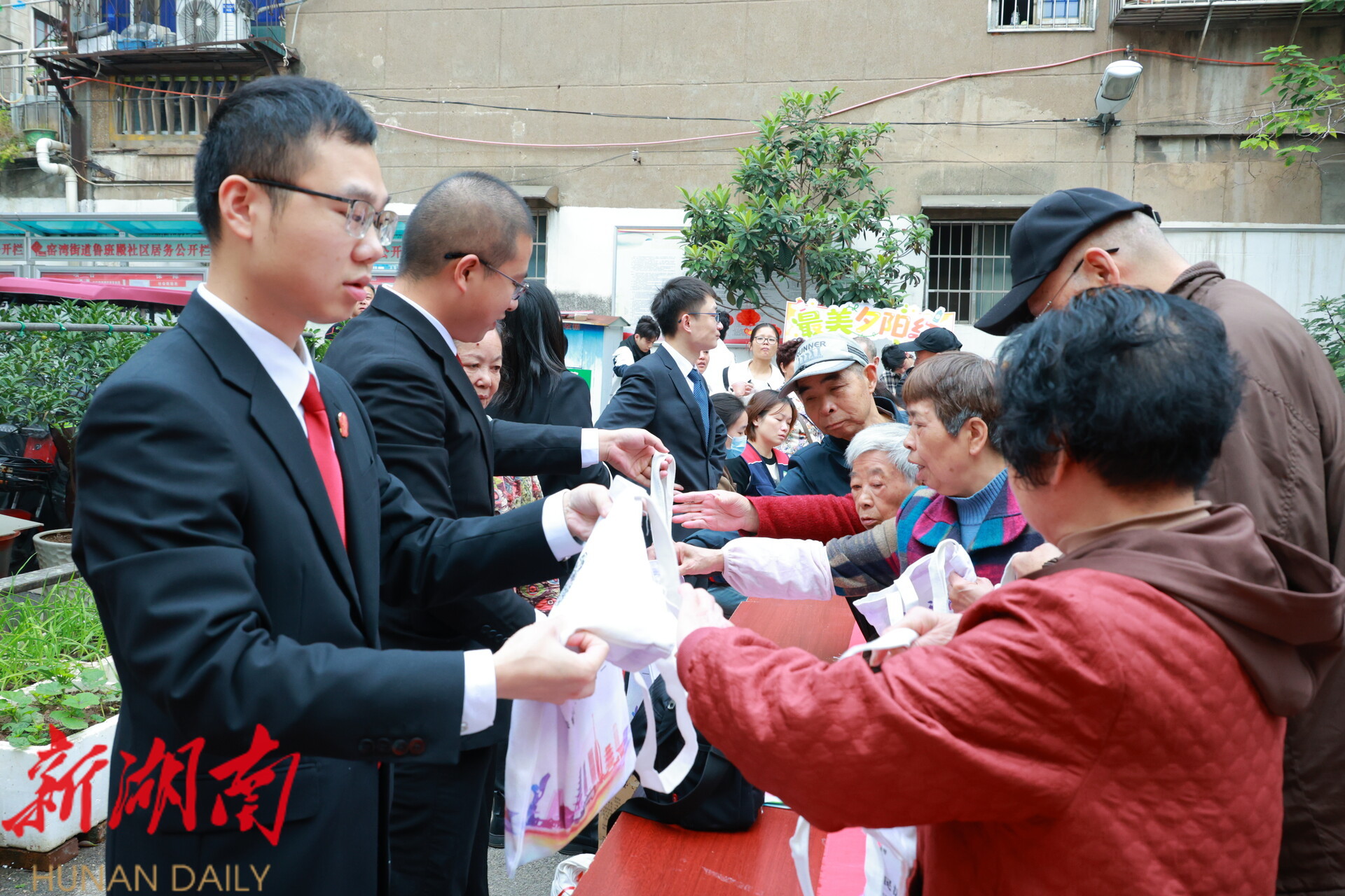 表演间隙,社区特别设置困难高龄老人慰问环节。社区联点单位湘潭市优化人居环境事务中心慰问了社区高龄及困难老人,为老人们送上了节日的祝福与关怀,让老人们切实感受到了来自社会大家庭的温暖;知识问答环节同样热闹,工作人员围绕重阳节习俗、敬老常识设计的题目,吸引居民踊跃参与,答对者收获精美礼品,在互动中传递传统文化知识。