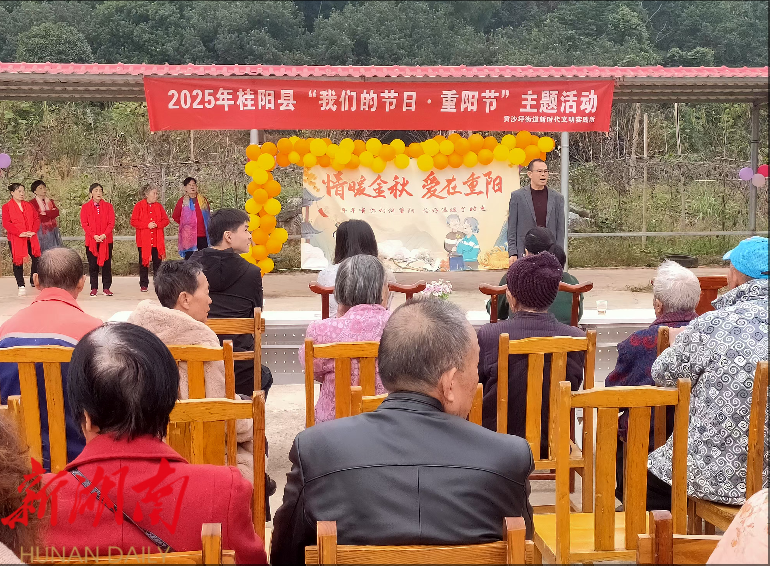 新桂阳10月29日讯(通讯员 颜琼慧)岁岁重阳,今又重阳。为弘扬“尊老敬老、弘扬孝道”的中华传统美德,落实县文明办精神文明建设与传统节日弘扬要求,黄沙坪街道新时代文明实践所在晚晴耄耋园养老服务中心于10月29日开展2025 年桂阳县“我们的节日・重阳节”主题活动。县委宣传部领导、黄沙坪街道办退休干部、晚晴养老院老人及家属、中医院医疗服务人员、街道新时代文明实践所志愿者等齐聚一堂,共庆重阳佳节。