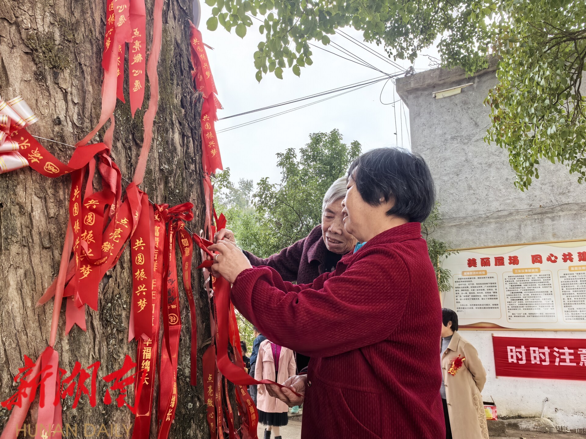 活动现场,百年重阳树枝繁叶茂,成为承载节日意义的独特载体。老人们围聚在重阳树下,手持祈福带写下美好心愿,传递对生活的热爱与对未来的期盼。随后,大家共同为重阳古树浇水施肥,以实际行动守护这份见证岁月的“文化资产”。
