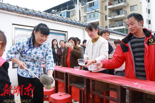 活动设计生日庆贺、文艺汇演、便民服务以及文明集市板块,活动现场,社区长寿老人到“擂茶制作区”,指导“易点亮”青年志愿者和儿童体验擂茶制作。